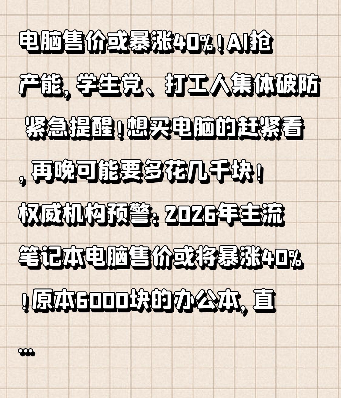 电脑售价或暴涨40%!AI抢产能,学生党、打工人集体破防 紧急提醒!想买电脑的赶紧看,再晚可能要多花几千块! 权威机构预警:2026年主流笔记本电脑售价或将暴涨40%!原本6000块的办公本,直接逼近9000块;学生党刚需的入门本,可能直接消失!消息一出,全网炸锅,这到底是怎么回事? 很多人以为是商家炒作,真相比你想的更残酷! 这次涨价,是AI抢产能+芯片涨价+成本失控三重暴击叠加。 AI大模型爆发,单台AI服务器的内存需求是普通电脑的8-10倍,三星、美光等巨头把80%产能转向高利润的AI芯片,留给我们用的内存、固态直接断供,价格半年暴涨3倍。 同时英特尔CPU涨价15%,台积电代工费、关税、物流成本全线上涨,一台电脑的核心成本直接翻倍。 厂商不涨价就亏本,涨价就没人买,陷入两难。更扎心的是,专家预测,4000元以下入门电脑或将彻底消失,学生、低收入群体想买台电脑都难。 电脑早已不是奢侈品,是打工人的饭碗、学生党的课桌、普通人的生活工具。 我们不是买不起,是不想为畸形的产能分配买单;不是不支持AI发展,是不想让科技进步,变成普通人的生活负担。 愿每一个需要电脑的人,都能买得起、用得上;愿产业发展,别再牺牲普通人的刚需。 你最近有买电脑的计划吗?会因为涨价推迟吗?评论区说说!