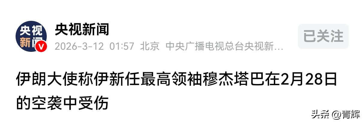 早就受伤了!伊朗透露:穆杰塔巴28号与父亲哈梅内伊一起遭遇了空袭 当地时间3月11号,伊朗驻塞浦路斯的大使萨拉里安对外公布了一则非常罕见的消息。他首先承认伊朗现任最高领袖穆杰塔巴确实是受伤了,但是受伤的时间居然是上个月的28号。而且就是美国和以色列针对自己的父亲哈梅内伊发动的那场致命空袭。 他说空袭发生的时候,穆杰塔巴就在现场和哈梅内伊在一起。当时父亲和一众高层阵亡,穆杰塔巴受伤。 现在伊朗发布的一些消息实际上已经虚虚实实了,如果按照这位大使的说法,那么穆杰塔巴应该是在受伤的情况下参与的选举,而28号的那场空袭中,美国和以色列发射了数枚导弹,现场的爆炸非常猛烈,身在咫尺的哈梅内伊都能当场阵亡,就站在旁边的穆杰塔巴难道真的只是受了一点轻微伤吗,这个概率似乎并不大。 如果穆杰塔巴伤得很重的话,那么这次伊朗最高领袖的选举到底是怎么回事?或者我们可以说的更直白一些,穆杰塔巴本人到底知不知道自己参与了最高领袖的选举?考虑到一直到现在为止,这位伊朗的最新领导人哪怕连公开讲话都没有,我个人认为,这次伊朗最高领袖的选举有可能是伊朗现任政权的高层联合在一起操纵的一个计划。