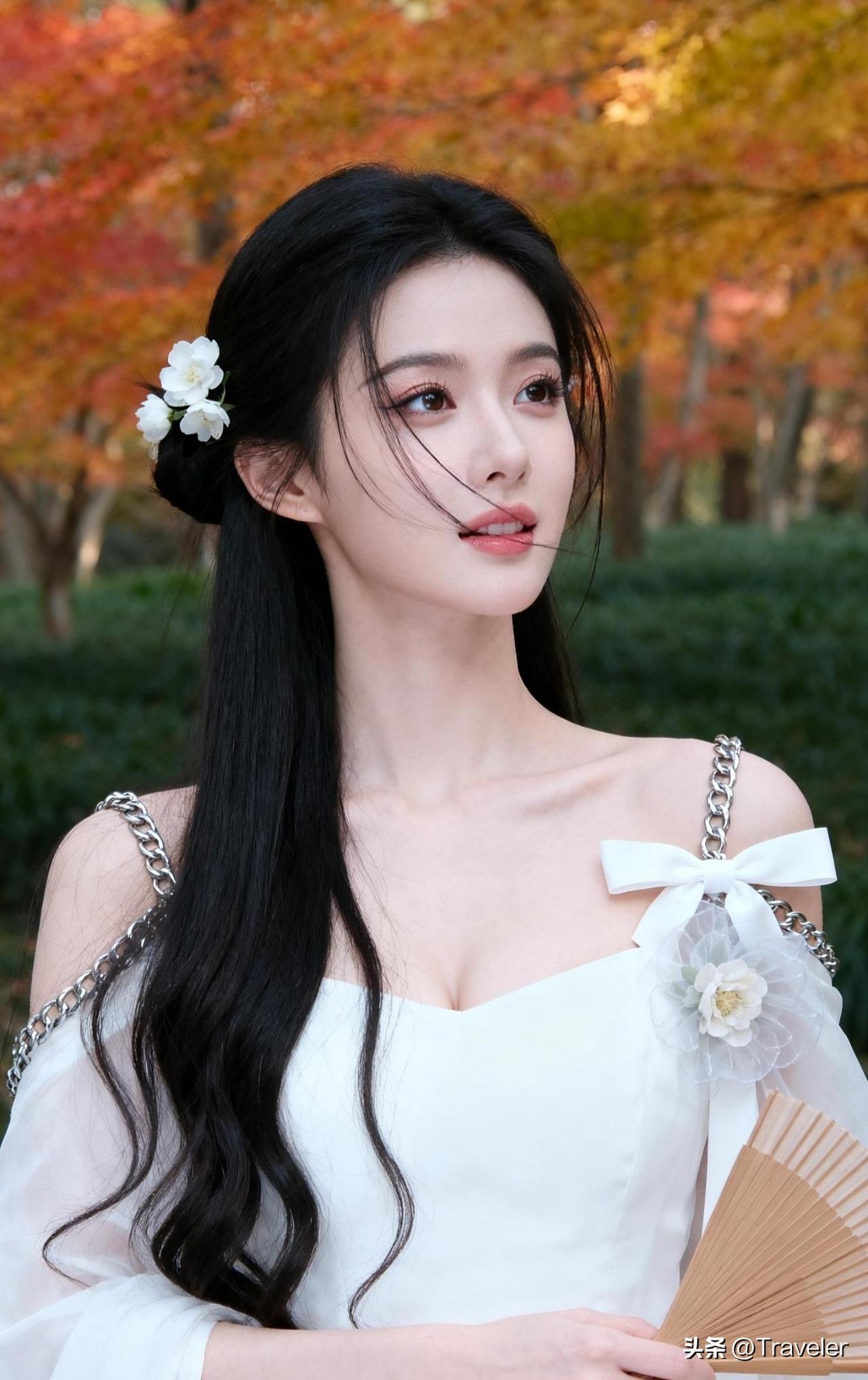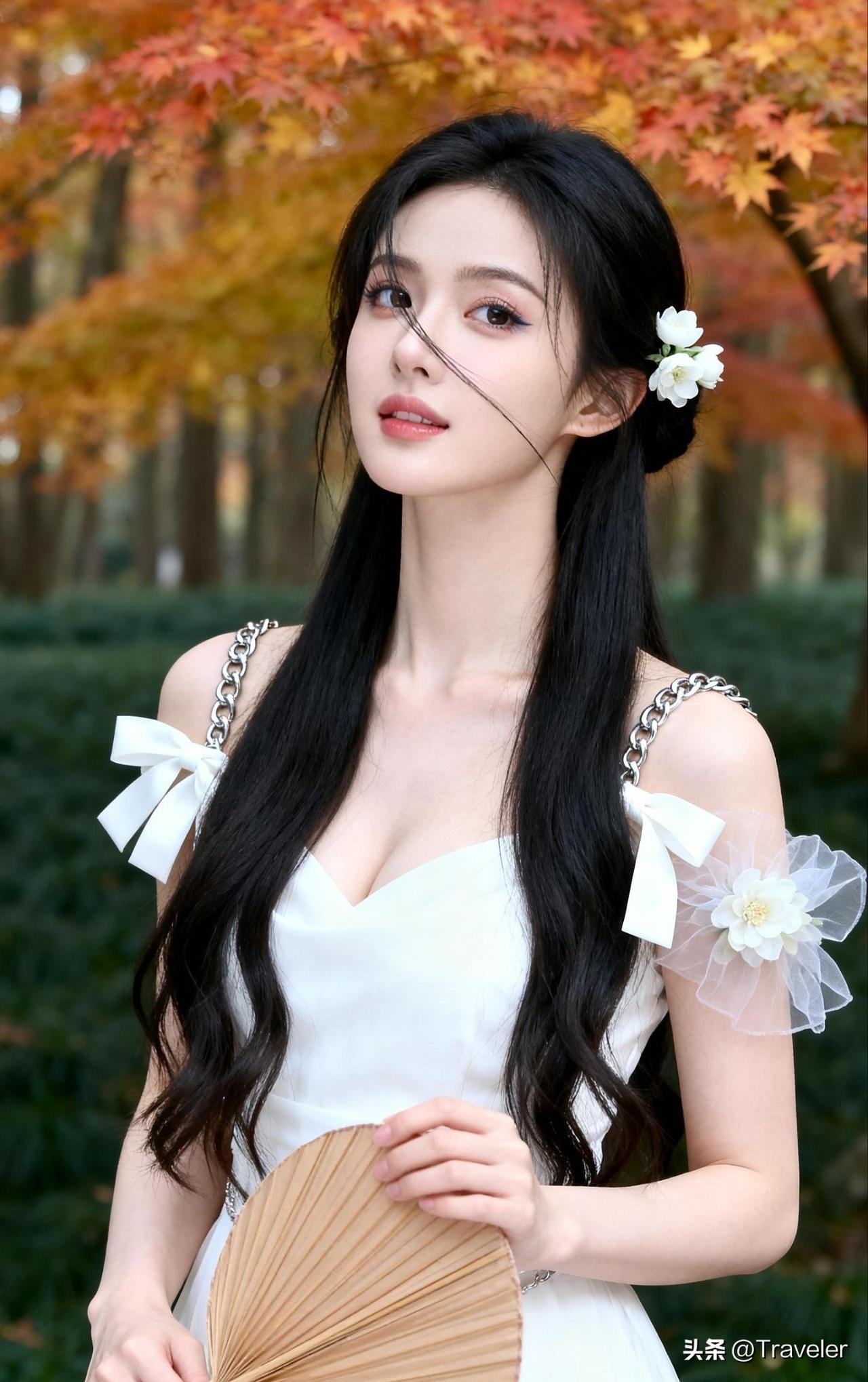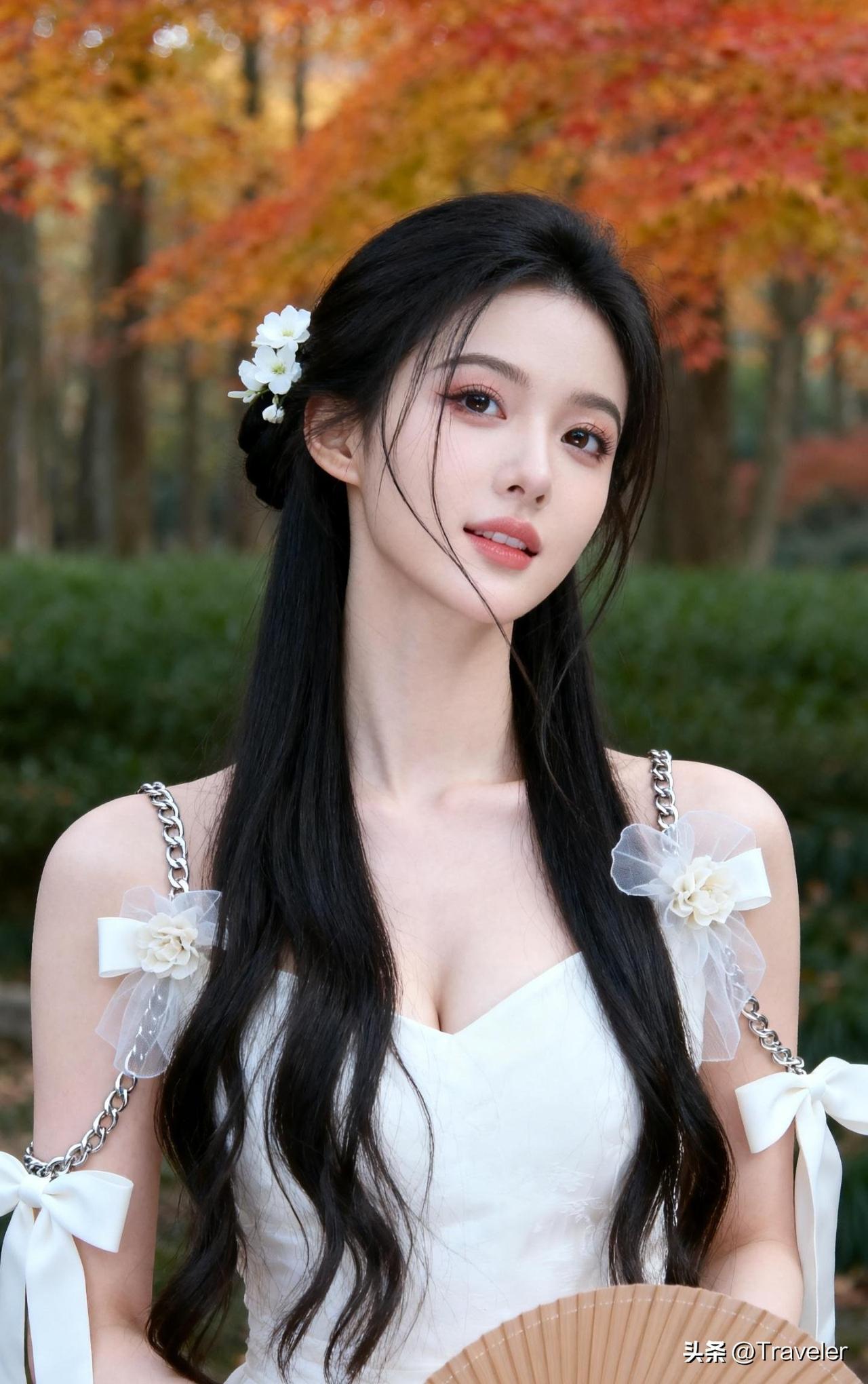 秋日漫步,白衣少女与枫叶相映成趣