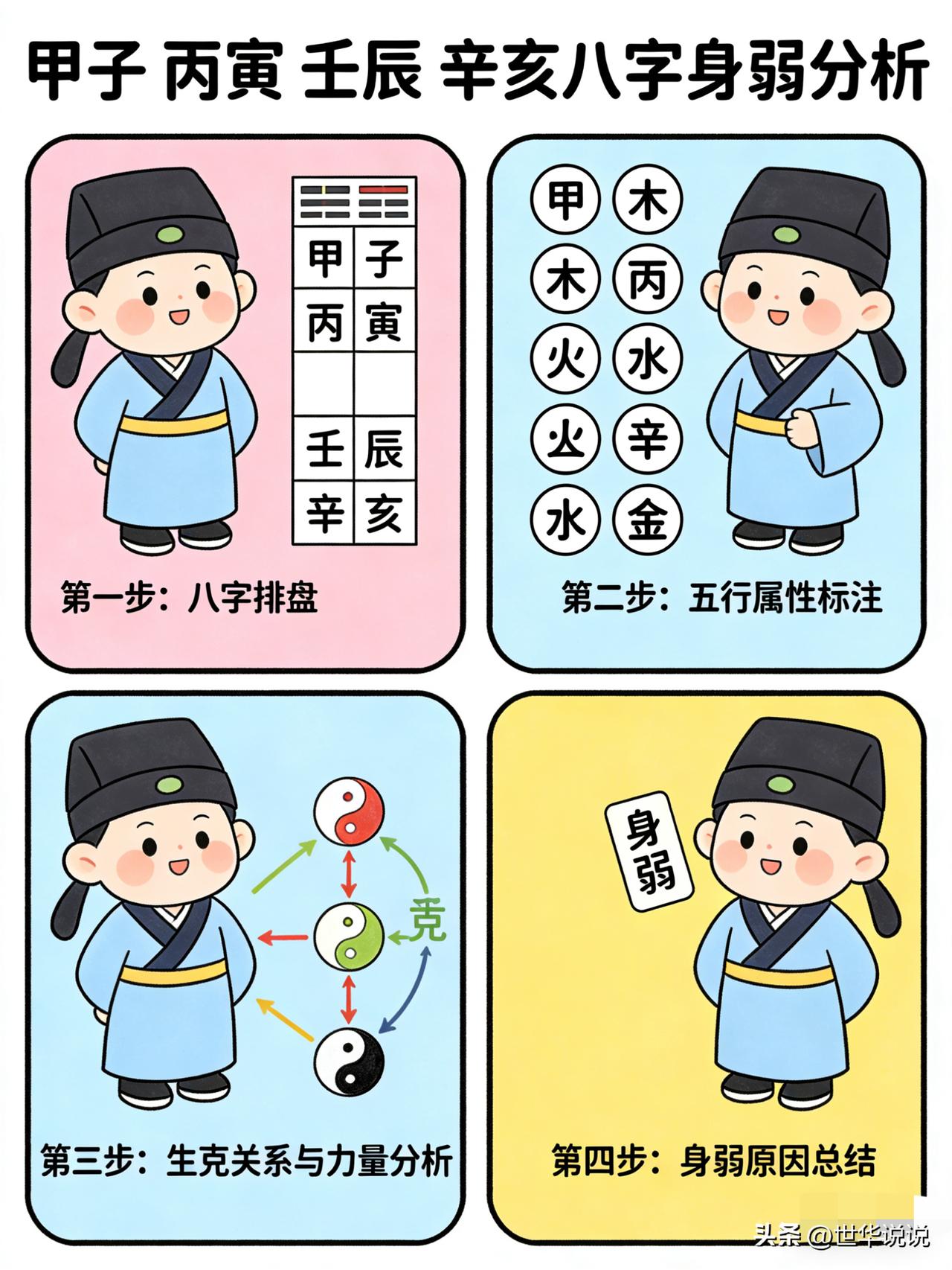 新手必看|八字身强身弱快速判断,2个例子讲透! 很多初学八字的朋友分不清日主身强还是身弱,其实不用死记硬背复杂理论,用快速打分法就能秒懂——生日主的加分、同日主的加分,超50分就是身强,低于50分就是身弱,等于50分再看其他字的作用关系就行。今天用2个真实例子,手把手教你判断,看完就能上手! 先搞懂:身强身弱不是“好坏” 先纠正一个误区:身强≠命好,身弱≠命差。身强是能量过剩,需要“克、泄、耗”来平衡;身弱是能量不足,需要“生、扶”来补充。它只代表命局的能量状态,和身体好坏、富贵贫贱没有直接关系,别搞混啦。 例子1:身弱判断(壬水日主) 八字:甲子 丙寅 壬辰 辛亥 日主:壬水 快速打分步骤: 1. 找生日主的字(印星,水生木不算,要生我的):局里没有直接生助壬水的印星,得分0; 2. 找同日主的字(比劫,同五行的水):子、亥都是水,2个同五行字,得分26 3. 总分:0+ 26=26 ✅ 结论:26<50,身弱。 拆解:壬水日主生于寅月(木旺耗水),周围没有帮扶的字,只有两个水根,能量明显不足,属于典型的“能量不足型”命局。 例子2:身强判断(庚金日主) 八字:乙亥 庚辰 庚午 甲申 日主:庚金 快速打分步骤: 1. 找生日主的字(印星,土生金):辰40分,得分40; 2. 找同日主的字(比劫,同五行的金):庚(10分)、申(20分)都是金,2个同五行字10分十20分= 30分,得分30 3. 总分:40+ 30=70 ✅ 结论:70>50,身强。 拆解:庚金日主得土生扶,又有金五行加持,能量过剩,属于“能量充足型”命局。 新手判断口诀(背下来就会) 1. 先看日主,再找生我的、同我的字,简单加分; 2. >50分 身强,<50分 身弱,等于50分的另作他论,要看周围的环境,以后慢慢说。 3. 身强要“克泄耗”,身弱要“生扶帮”,中和才是贵气根。 合规提醒(必看) 分享命理知识只做传统文化科普,不承诺“改命、消灾、招财”,不诱导付费,不做绝对化吉凶预言,严格遵守平台规则。 总结 身强身弱判断核心就两点:找对帮扶字+快速算分。新手先练熟打分法,再慢慢深入“得令、得地、得势”的深层逻辑,关注我,带你系统学八字! 八字入门 身强身弱 命理科普 新手学八字