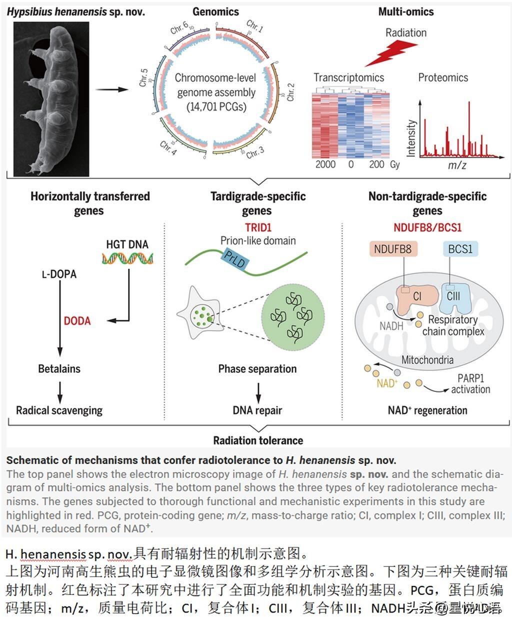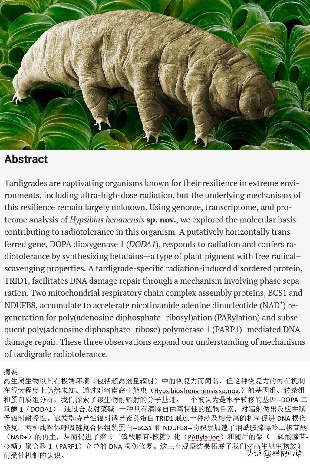 Science重磅!水熊虫不死之谜终于被中国团队破解了 谁能想到,身长不到1毫米的水熊虫,竟是抗辐射界的王者! 人类5Gy辐射就会致死,它却能扛5000Gy的γ射线,上千倍的耐受度太逆天了。这次中国科研团队从河南伏牛山发现的新种水熊虫,直接揪出了它的抗辐射密码,还登上了Science,真的太提气了! 它的保命全靠三大法宝:从细菌植物“借”来的DODA1基因,合成甜菜色素清自由基;专属的TRID1蛋白,靠相分离快速修复DNA损伤;还有BCS1和NDUFB8蛋白,加速能量再生助力修复,三套机制环环相扣,堪称完美。 更惊喜的是,把这些抗辐射基因转到人类细胞,抗辐射能力居然真的提升了!这可不是单纯的生物研究,更是给太空探索、核工业防护开了新路子。 小小的水熊虫藏着大大的生命智慧,这波研究不仅解锁了极端生命的奥秘,更让人类在抗辐射领域看到了新希望,为中国科研团队点赞!