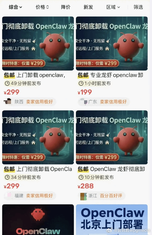 装虾499 卸载299,Openclaw用户市场实现收割闭环OpenClaw近期火爆全网,以其接管操作,处理部分工作流的强大能力点燃了网民们的热情。但火爆的背后藏着许多问题:安全问题,Token费用导致"养殖"成本高,等等。据一些媒体称,在这场“龙虾热”中,清醒的永远是类似于在淘金热中卖铲子的那些人,当大家还在为如何配置模型头大时,各种安装服务、代部署服务已经赚得盆满钵满;而如今越来越多的人开始后悔之际,一种新的生意诞生了,“上门卸载OpenClaw仅需299”:据相关媒体报道,如今在一些OpenClaw的交流群内,常有人打着“原价500,限时优惠现仅需299”的幌子来“手把手教你卸载龙虾”,卖铲子的人完成了一次完美的闭环收割。