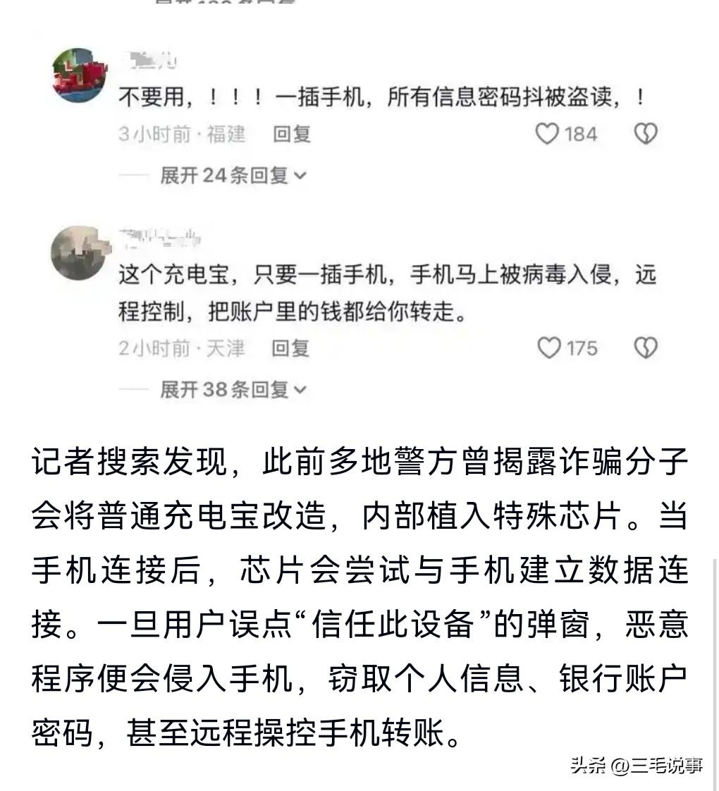 社会上的骗局太多了,真是让人防不胜防啊!很多被骗的都遭受到了金钱上的损失,那些骗子实在是太可恶了,要是每一个骗子都能得到应有的惩罚,那该多好啊。 近日,一网友反映收到三个陌生的充电宝也不知道是谁寄的。 网友提醒她千万不要用,要不然的话可能会盗取个人信息,造成金钱上的损失。 现在这高科技犯罪真是让人瑟瑟发抖啊。