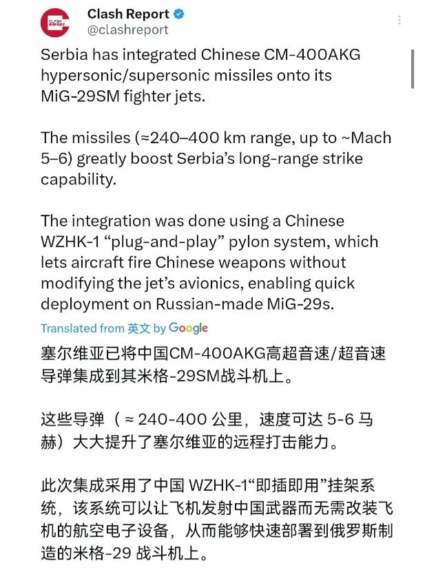 塞尔维亚受刺激了!塞尔维亚成为了欧洲首个列装中国超音速空射导弹的国家!塞尔维亚紧急将中国CM-400AKG高超音速导弹集成到其米格- 29战斗机上。3月11日,根据外媒报道,就在中东局势紧张之际,塞尔维亚紧急将射程240-400公里,速度高达~ 5-6马赫的CM-400AKG高超音速集成到了米格- 29战斗机了。外媒称,这一挂载将极大地增强塞尔维亚的远程打击能力。 可能很多人不清楚,这款CM-400AKG导弹到底有多厉害,它的射程能达到240到400公里,这个距离是什么概念? 就是塞尔维亚的战斗机不用飞出自己的领空,就能打到周边几百公里外的目标,不用再冒险闯别人的防空圈。 它的速度能达到5马赫左右,比声音快5倍,现在很多国家的防空系统,想拦截这种速度的导弹都很难,因为留给防空系统反应的时间太短了,有时候只有几秒钟,根本来不及准备。 还有人会问,这款导弹是不是高超音速?其实准确来说,它是超音速导弹,外媒有时候会称它为高超音速,不过不管怎么说,它的速度和突防能力都足够强。 这款导弹是中国航天科工集团研制的,之前已经在巴基斯坦空军服役过,去年印巴冲突的时候,巴基斯坦用挂载这款导弹的枭龙战机,成功打击了印度的防空阵地,证明了它的实战效果很好,这也是塞尔维亚选择它的一个重要原因。 它还能精准打击雷达站、指挥所、舰船这些高价值目标,配备的战斗部能有效摧毁这些目标,而且维护起来也简单,成本也不高,很适合塞尔维亚这样的国家使用。 塞尔维亚之所以这么着急把这款导弹装到米格-29上,核心就是受了周边环境和国际局势的刺激。 塞尔维亚身处巴尔干地区,这个地方历史上就不太平,尤其是科索沃问题,悬了几十年,塞尔维亚一直不承认科索沃独立,双方的摩擦从来就没断过。 去年,克罗地亚、阿尔巴尼亚和科索沃还联合签署了防务合作宣言,要搞联合军事演习,塞尔维亚总统直接把这个组合称为 “侵略性军事联盟”,可见压力有多大。 更关键的是,塞尔维亚不是北约成员国,没有集体防御的保护,周边很多国家都是北约成员,北约对塞尔维亚的挤压一直没停过。 美欧还长期对塞尔维亚进行军备封锁,它想买西方的先进武器,要么买不到,要么就是被 “阉割” 过的,没有关键的打击能力;想从俄罗斯买先进装备,也会被北约阻挠。 之前塞尔维亚的米格-29战机,虽然经过升级,但只能挂载射程30公里的导弹,要执行对地打击任务,就得硬闯别人的防空圈,和 “送人头” 没什么区别,根本没有真正的远程打击能力。 最近中东局势越来越紧张,塞尔维亚担心这种紧张局势会波及到自己,再加上周边的安全威胁越来越大,它知道,只有自己的实力强了,才能不被别人欺负,所以才紧急推进导弹和战机的集成工作。 可能有人会疑惑,米格-29 是苏联时期的俄制战机,中国的导弹怎么能挂上去?其实这事难度很大,俄制战机的控制系统、数据接口和中国导弹完全不兼容,西方专家之前还说这根本不可能实现。 但中国军工想出了一个务实又高效的办法,就是用外置式火控挂架,这个挂架看着普通,里面却集成了导航、火控计算机和独立电源,相当于给导弹装了一个独立的 “迷你大脑”,不用拆战机的内部零件,也不用改战机的原有系统,只要挂到战机的重载挂点上,飞行员在座舱里用便携终端输入任务参数,就能控制导弹发射,既省时间又省成本,只用了半年时间就完成了适配和测试。 这件事对塞尔维亚来说,意义重大。之前它没有真正的远程打击能力,在地区局势中一直处于被动,现在有了这款导弹,战机可以在安全区域对敌方纵深目标实施打击,远程打击能力实现了质的飞跃,也让它在巴尔干地区有了更强的威慑力,北约和周边国家再想介入科索沃问题,就得好好掂量一下。 对中国来说,这也是一个重要的突破,这是CM-400AKG导弹第一次被挂到俄制战机上,证明中国武器不仅性能好,兼容性也很强,打破了 “中式装备只能配中式战机” 的偏见,也打破了西方在国际军贸市场的垄断。 之前很多国家觉得,买了某国的战机,就只能用该国的导弹,被牢牢绑定,而中国的解决方案,让很多中小国家看到了新的选择,不用再受制于西方。 其实说到底,塞尔维亚这么做,就是为了自保,在复杂的国际环境中,没有足够的国防实力,就只能被动挨打,伊朗之前就因为国防短板吃了亏,塞尔维亚不想重蹈覆辙。 中塞之间的合作,没有任何政治附加条件,就是互利共赢,中国提供靠谱、高性价比的武器,塞尔维亚提升自己的国防实力,守护自己的国家主权和领土完整。 现在,塞尔维亚成为欧洲首个列装中国超音速空射导弹的国家,不仅改变了自身的国防格局,也给欧洲的军备格局带来了新的变化。 它用实际行动证明,中小国家也有权利选择适合自己的国防装备,不用看西方的脸色,只有自身强大,才能在复杂的国际局势中站稳脚跟。
