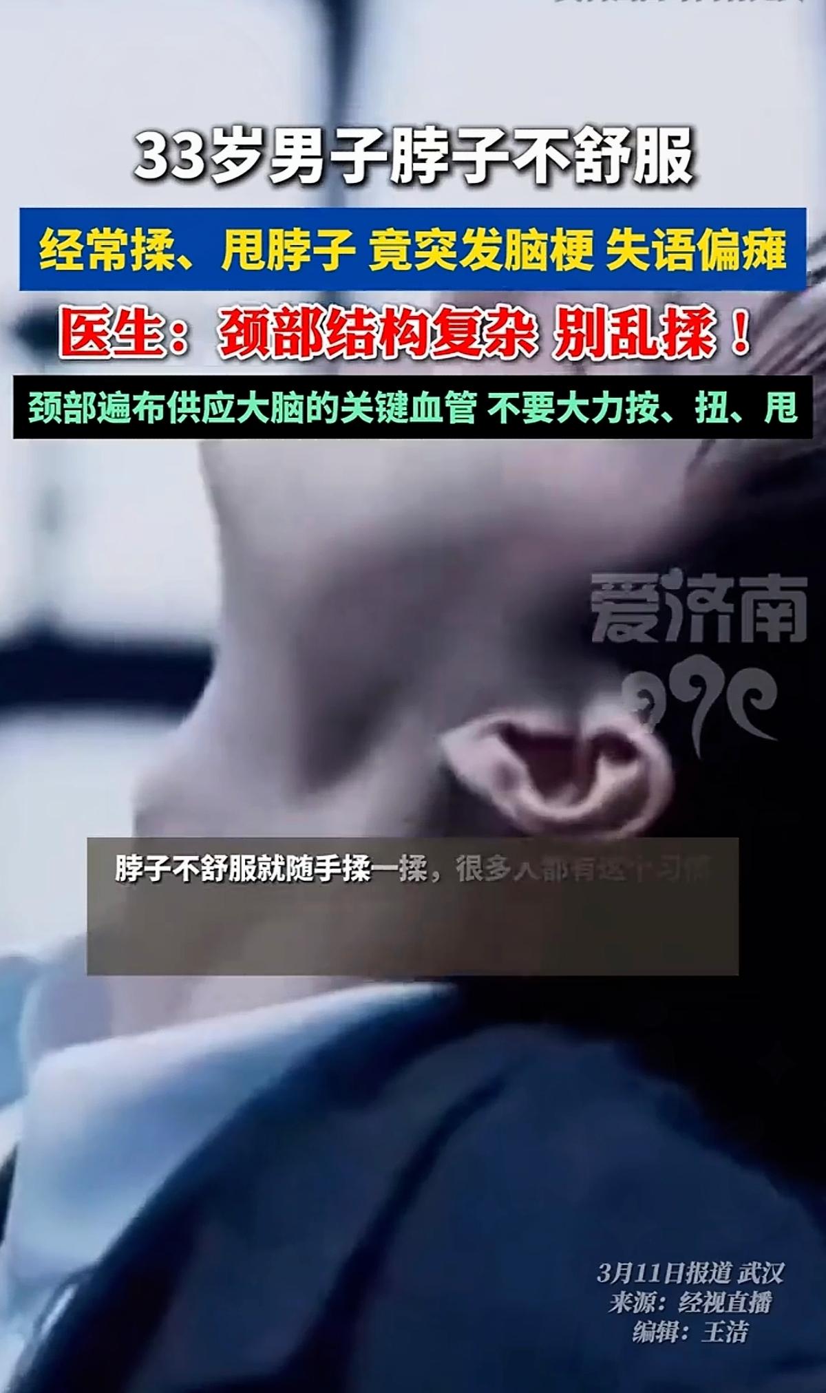 33岁正值壮年,只是脖子不舒服总爱揉一揉,没想到直接突发脑梗,这事真的给所有人敲了一记警钟。 很多年轻人总觉得脑梗是老年病,自己年纪轻、身体好随便揉揉脖子、扭一扭根本不当回事。可现在久坐、低头玩手机的人太多,颈椎早就出了问题,颈部血管也容易受损、形成斑块。随便揉捏、大力扭转很可能让斑块脱落,顺着血管堵到脑部,直接诱发脑梗。 别再把脖子酸痛当成小毛病,随便乱按乱揉,其实是在拿命冒险。身体发出的不舒服信号,从来都不是小事,一拖再搓自己瞎处理,代价真的太大。 平时你脖子不舒服,会自己随便揉吗?都有哪些护颈习惯?脑梗预防知识 脑梗死急救