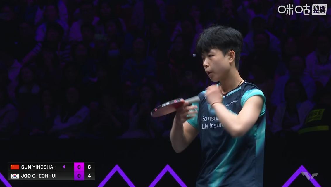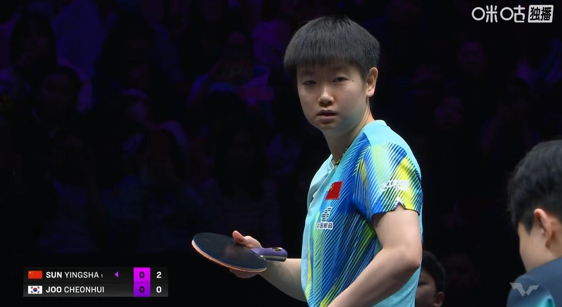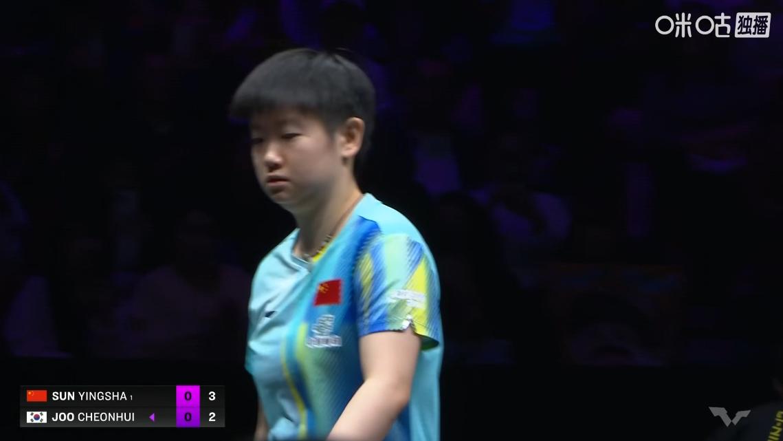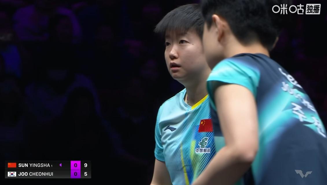 莎莎绝对是放松打的开创者, 单纯依靠落点变化就完全限制住了朱芊曦的前三板, 开局取得5:3领先, 莎莎连续两个反手变线, 将比分扩大到8:4, 莎莎的第三板上手威力还是非常大, 朱芊曦的进攻节奏被彻底打乱了, 现场球迷也是出来捣乱, 莎莎赶忙化身莎局控制场面, 朱芊曦连吃了莎莎两个发球, 正手回球失误, 11:5,莎莎先下一城