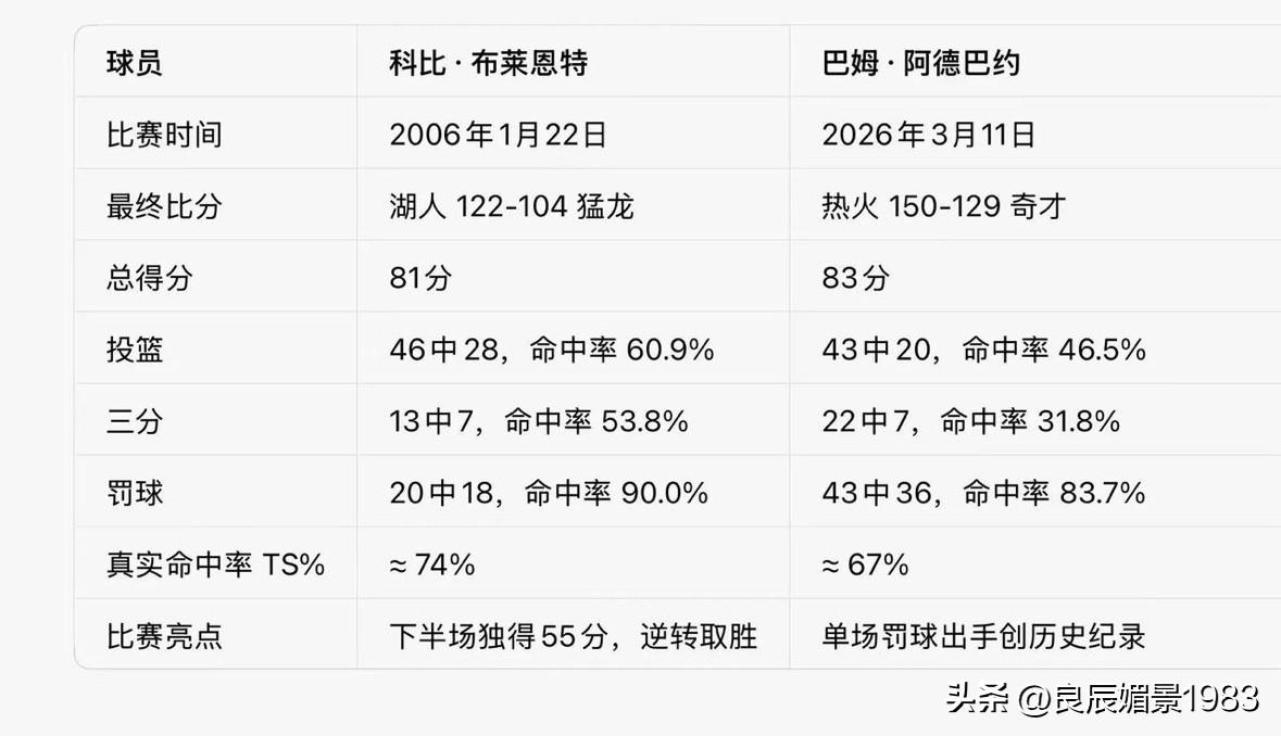 从“含金量”或者说比赛质量和历史评价的角度来看,科比·布莱恩特的81分远高于阿德巴约的83分。 虽然阿德巴约在数字上以2分优势超越,但两场比赛在背景、过程、效率和精神内核上存在巨大差异,导致其质量和在篮球迷心中的地位天差地别。 🏀 科比 81 分:逆境中的英雄史诗 * 比赛背景:2006年,湖人队在对阵猛龙队的比赛中,半场一度落后18分。科比是在球队处于绝境、需要个人英雄主义来力挽狂澜的情况下,开启了得分模式。 * 比赛过程:科比下半场独得55分,几乎凭一己之力完成了惊天逆转。他的每一分都与比赛胜负紧密相关,是在对手严防死守、甚至采用多人包夹的情况下强投命中的。 * 得分效率:全场46投28中,命中率高达 60.9%,三分球13投7中(命中率53.8%),罚球20罚18中。得分方式多样,涵盖了从三分线外到篮下的各种高难度投篮,展现了极致的进攻技巧和效率。 * 精神象征:“81分”是“曼巴精神”的最佳体现,象征着在逆境中永不放弃、为胜利而战的极致个人英雄主义,激励了无数后辈球员和球迷。 🤔 阿德巴约 83 分:顺境下的纪录之夜 * 比赛背景:2026年,热火队实力远超对手奇才队,比赛从首节开始就呈现一边倒的局势,热火全程领先,最大分差一度超过30分。 * 比赛过程:在胜负早已失去悬念的“垃圾时间”,为了冲击高分纪录,热火全队刻意为阿德巴约喂球,并在末节采用犯规战术停表,为他创造额外的得分机会。这种行为被广泛认为是“刷分”。 * 得分构成:全场43投20中,命中率为 46.5%,三分球22投7中,但获得了创纪录的43次罚球机会,命中36球。罚球得分占比极高,这与现代NBA的规则偏向进攻和保护球员有关。 * 时代特点:这场比赛被视为现代篮球数据膨胀和流量经济下的产物。虽然达成80+的得分依然需要超强的个人能力,但其过程和背景与科比的经典之战不可同日而语。 ⚖️ 核心差异对比 对比维度 科比 81 分 阿德巴约 83 分 比赛局势 落后18分绝境下逆转 全程大比分领先,垃圾时间刷分 投篮效率 60.9% (效率极高) 46.5% (效率一般) 罚球占比 20次罚球 (占得分22%) 43次罚球 (创纪录,占得分超43%) 竞技对抗 强硬的身体对抗,多人包夹 顺风局,对手防守强度低 精神内核 为胜利而战的英雄主义 为创造纪录的团队行为 总而言之,科比的81分是公认的篮球史上含金量极高的传奇表演,是一场为赢球而生的史诗级个人秀。而阿德巴约的83分则更多地被看作是一个在特殊背景下诞生的数据纪录,其过程和方式引发了巨大的争议,其历史地位和受到的尊重远不及科比的81分。