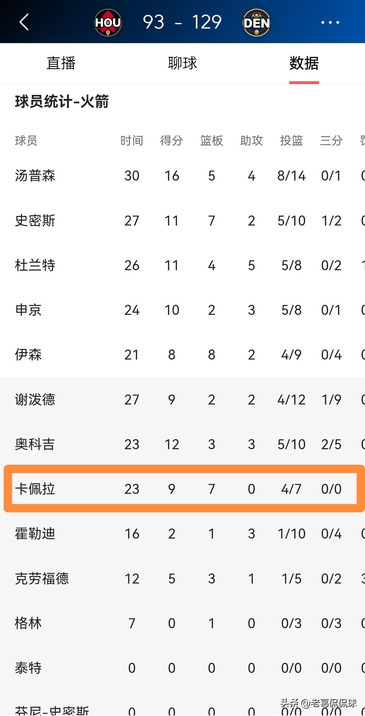 我必须要称赞一下火箭老将卡佩拉的拼劲!尽管今天火箭在客场以93:129惨败于掘金,但是卡佩拉在攻防两端都展现出了非常强的拼劲,他在替补出战的23分钟里,投篮7中4,其中罚球2中1得到9分,还有7篮板1抢断1盖帽,其中包括6个前场篮板。 实事求是的说,本场比赛卡佩拉和奥科吉是火箭阵中最想赢球和拼劲最强的球员,他们在攻防两端都不遗余力。