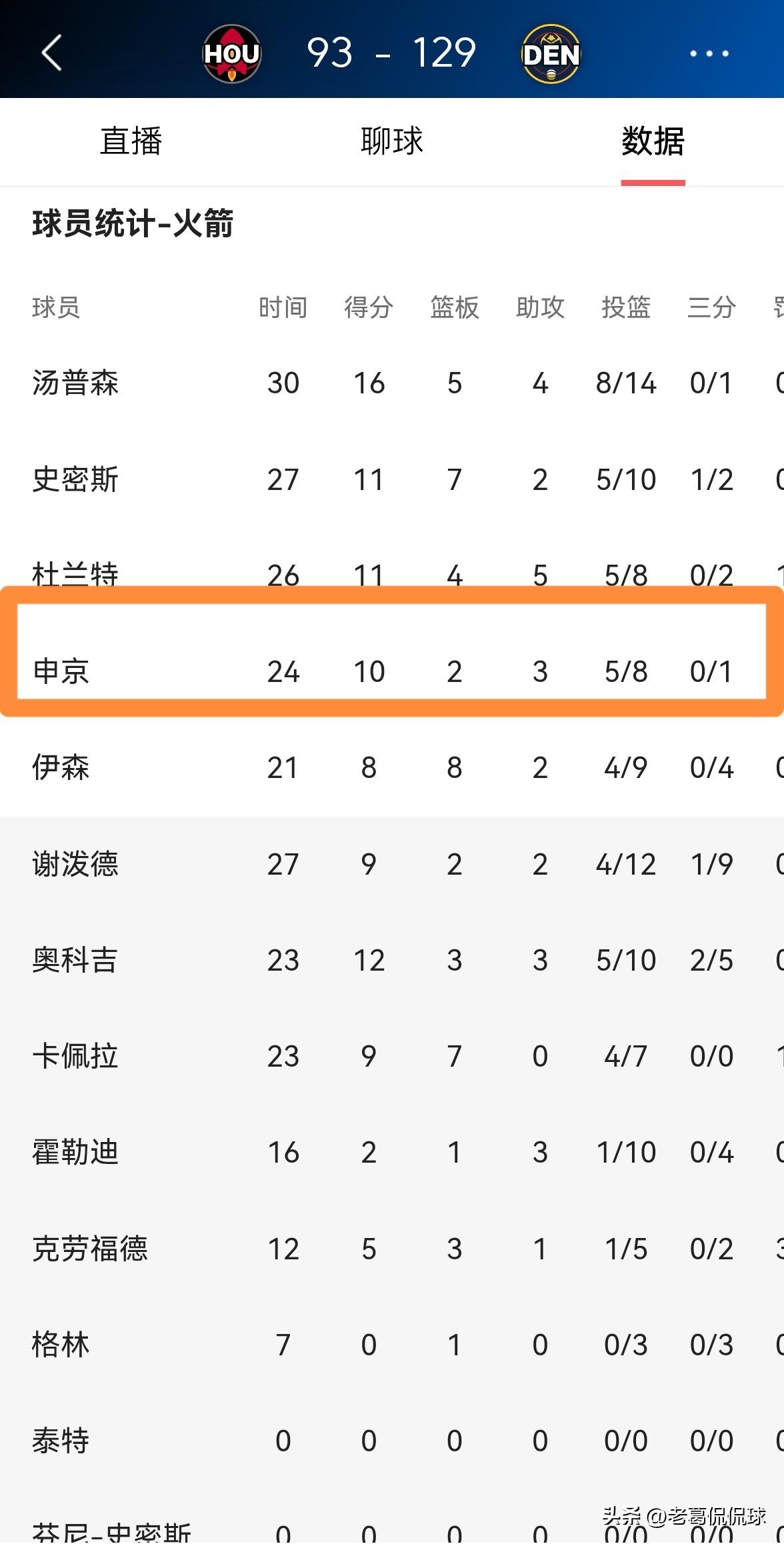 火箭超级中锋申京真是太黯淡无光了!在今天火箭客场以93:129惨败于掘金的比赛中,申京完全成为了约基奇的陪衬,申京在约基奇面前显得特别暗淡。 全场比赛下来,申京首发出战24分钟,投篮8中5仅仅得到10分2篮板3助攻,他的场上正负值为-17。 虽然申京和约基奇同为全明星球员,但是申京的表现和约基奇相比完全不在一条水平线上。