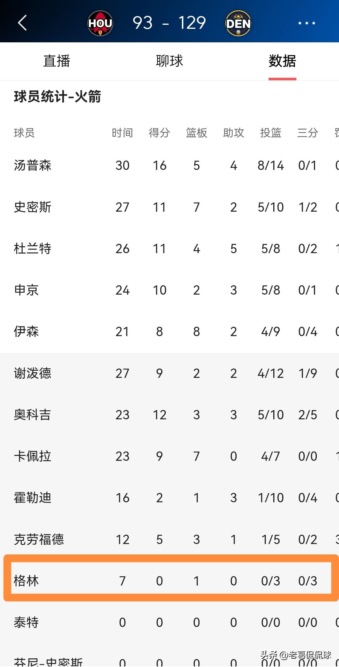 火箭老将杰夫-格林应该就地退役了!在今天火箭客场以93:129输给掘金的比赛中,39岁的格林在替补登场的7分钟里,投篮3中0怒砍0分,他的场上正负值为-3。 坦白说,以老格林目前的竞技状态来看,他已经无法适应当今NBA的强度和节奏了,选择退役才是老格林最好的抉择。