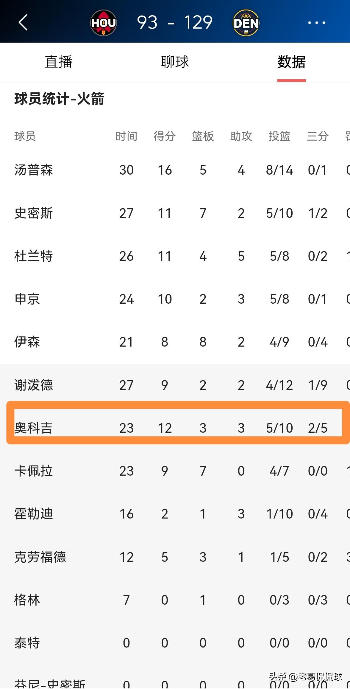 火箭悍将奥科吉终于回归正常了!虽然今天火箭在客场以93:129惨败于掘金,但是奥科吉终于找回了久违的进攻状态,他在替补出战的23分钟里,投篮10中5,其中三分球5中2非常高效的砍下12分,还有3篮板3助攻1抢断1盖帽,没有出现任何的失误。 虽然本场比赛的惨败会让无数的火箭球迷感到失望,但是奥科吉的复苏多少可以让火箭球迷们感到一些欣慰。