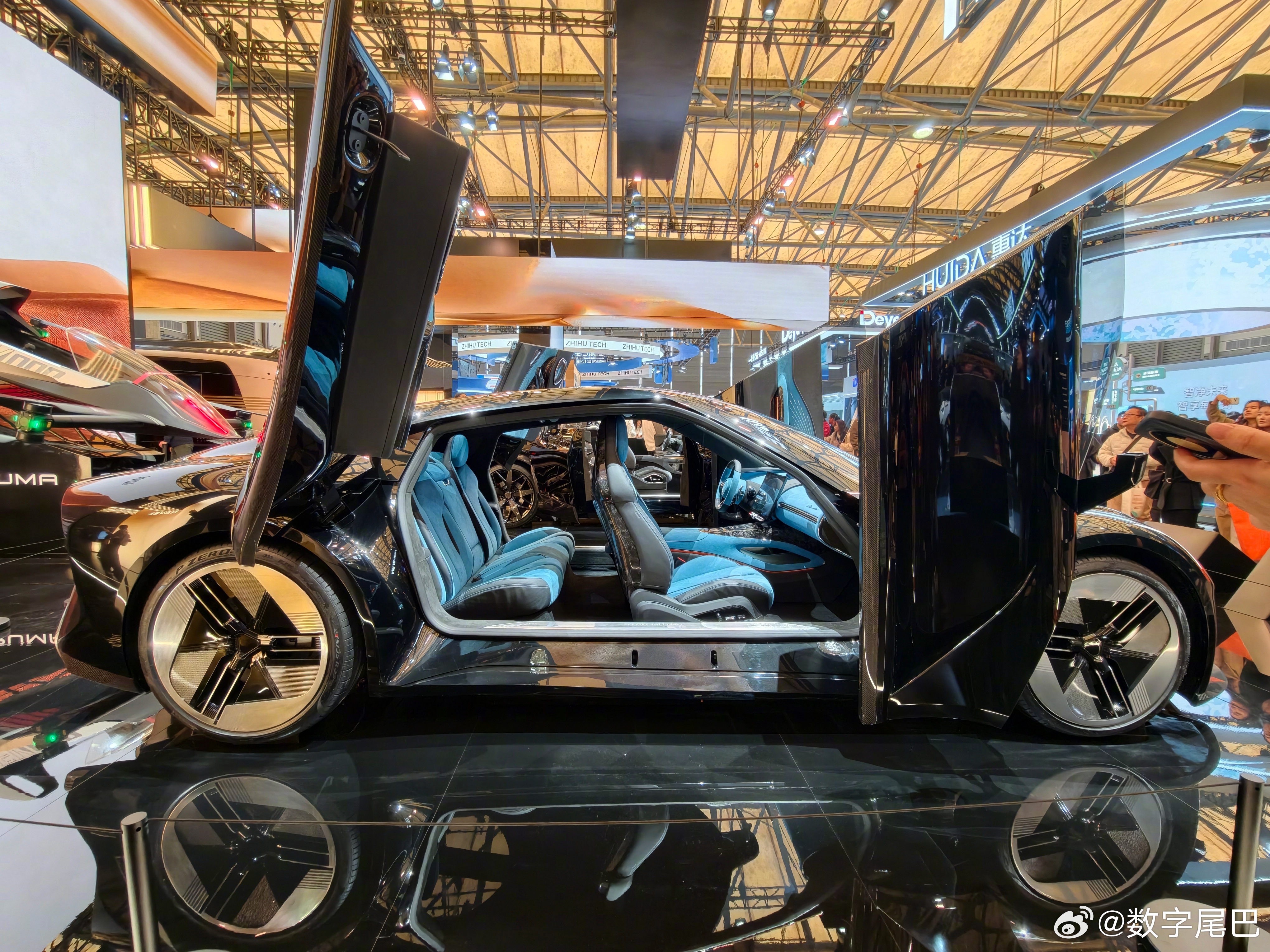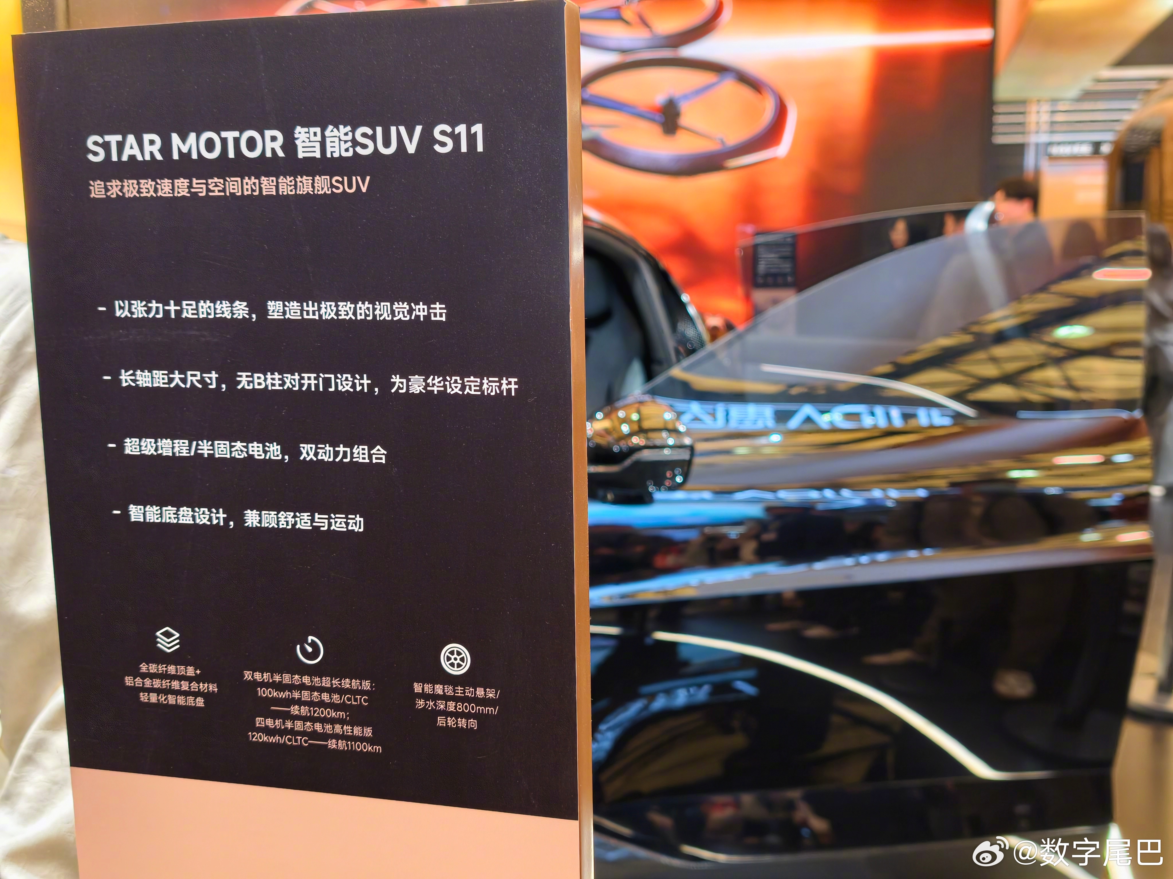 追觅系 NAVEE 也展出了两辆车,轿跑 STAR MOTOR S10 和 SUV S11,一个剪刀门一个对开门