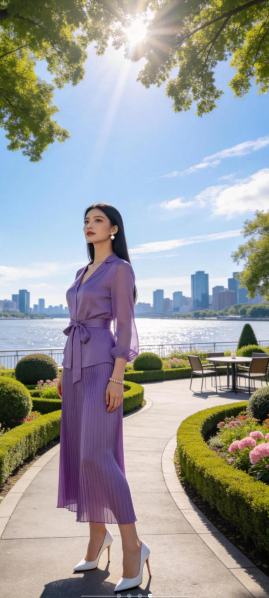 背景阳光洒满的滨江公园,以仰视角度呈现全景。蓝天澄澈,几缕白云轻飘,阳光透过茂密的绿树洒下,园内绿树成荫,花草繁盛,修剪整齐的绿篱勾勒出规整的园地,各色灌木造型别致,还有粉色花朵点缀其间。宽阔的江水波光粼粼,对岸是城市的建筑群。灰色步道蜿蜒穿过花园,沿途有户外桌椅,整体氛围清新自然、静谧惬意,充满生机。
