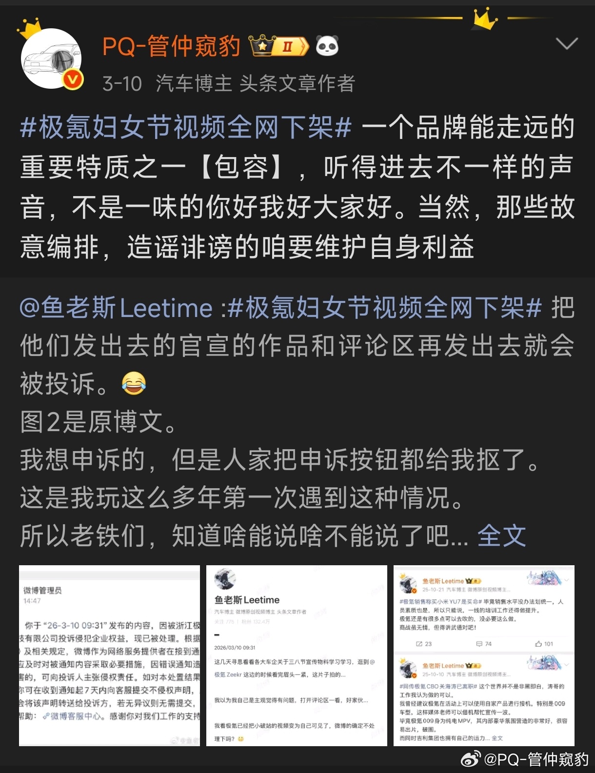 转发了一个极氪妇女节视频全网下架 的博文收到了两个评论,有人知道这个说法的真实性吗?1.话说这个首发好像是个自媒体账号,官号这是背锅了吧,转载的内容却被当成靶子。