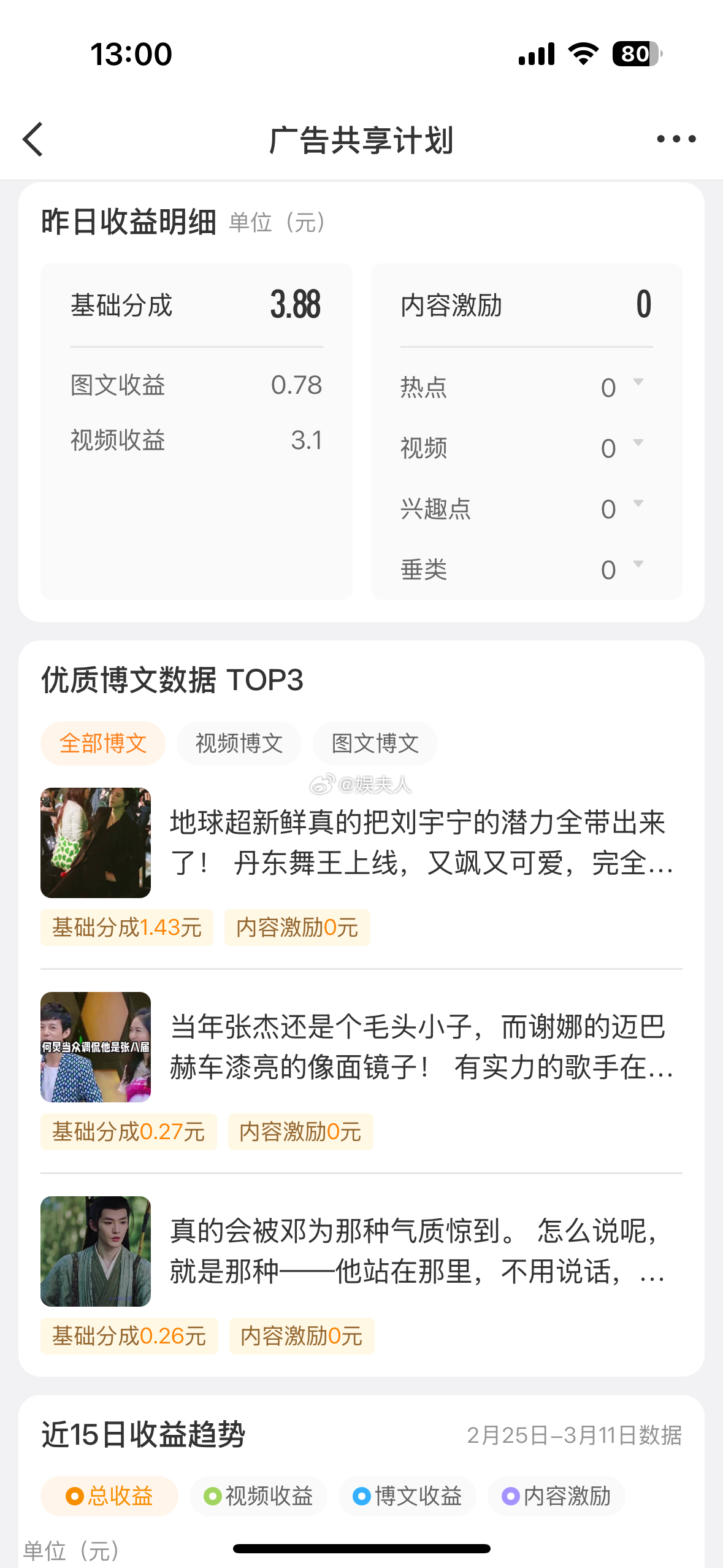 昨天给两块多也就算了,我想着今天可能会多一些吧!毕竟也是个热源,怎么着也得给个¥10 ¥8意思一下吧!结果就这3.88……狗看了都摇头哈哈哈哈… 80多万的娱乐博主,不知道的还以为多赚钱呢!平时也就算了,热源你都不给个¥10 ¥8,娱乐领域也是到头了哈哈哈