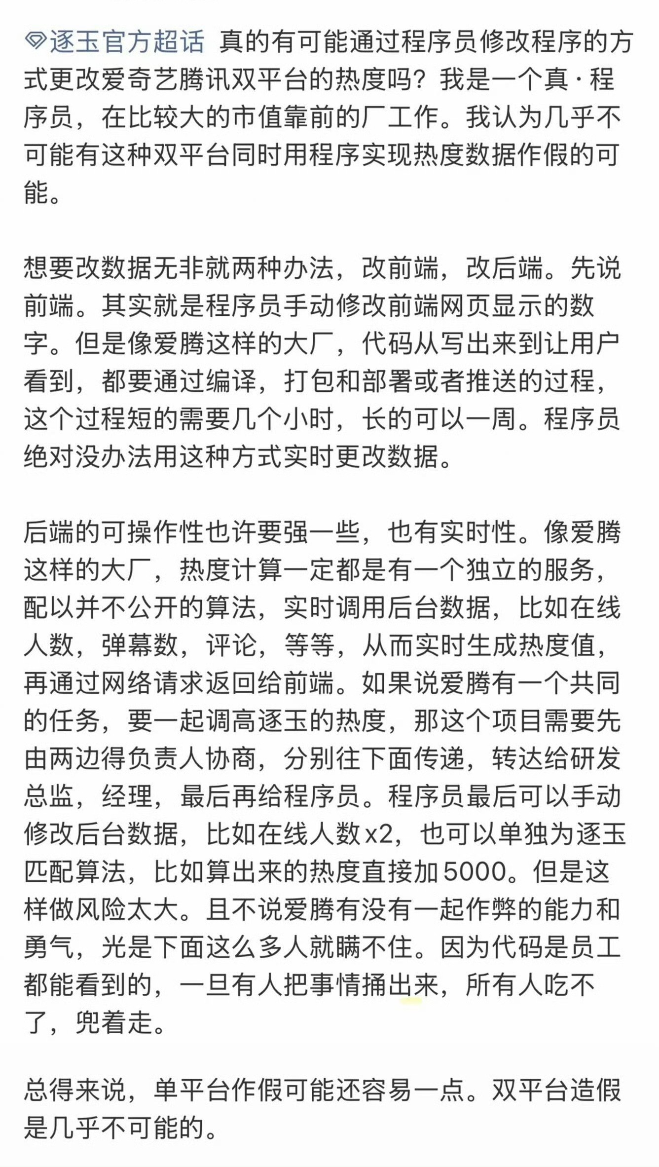 真·程序员来认证《逐玉》双平台造假是几乎不可能的……