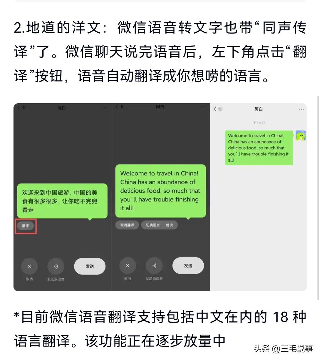 好消息好消息啊,微信推出三大新功能。 每一个都是网站的功能啊,非常的实用啊。 微信真的是越来越好用了。 真是大大的方便了。人们的生活也越来越离不开了。 毕竟用户人数实在是太多了。 有隐身的弹窗,能够很好的保护自己的隐私,不得罪对方。 有那个翻译的功能,时刻翻译成想要的语言。 再一个就是屏幕的锁定,再也不用担心视频时突然中断了。