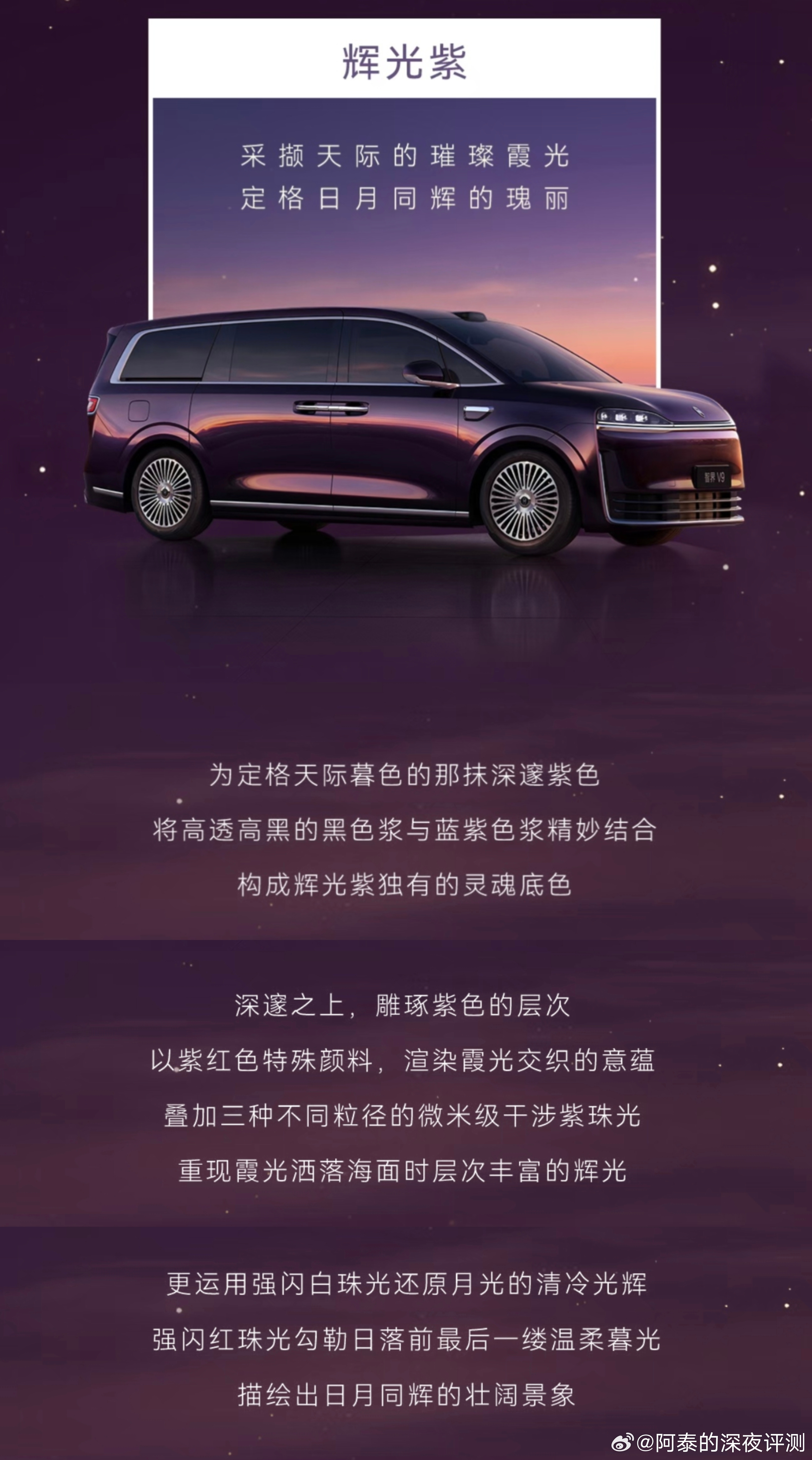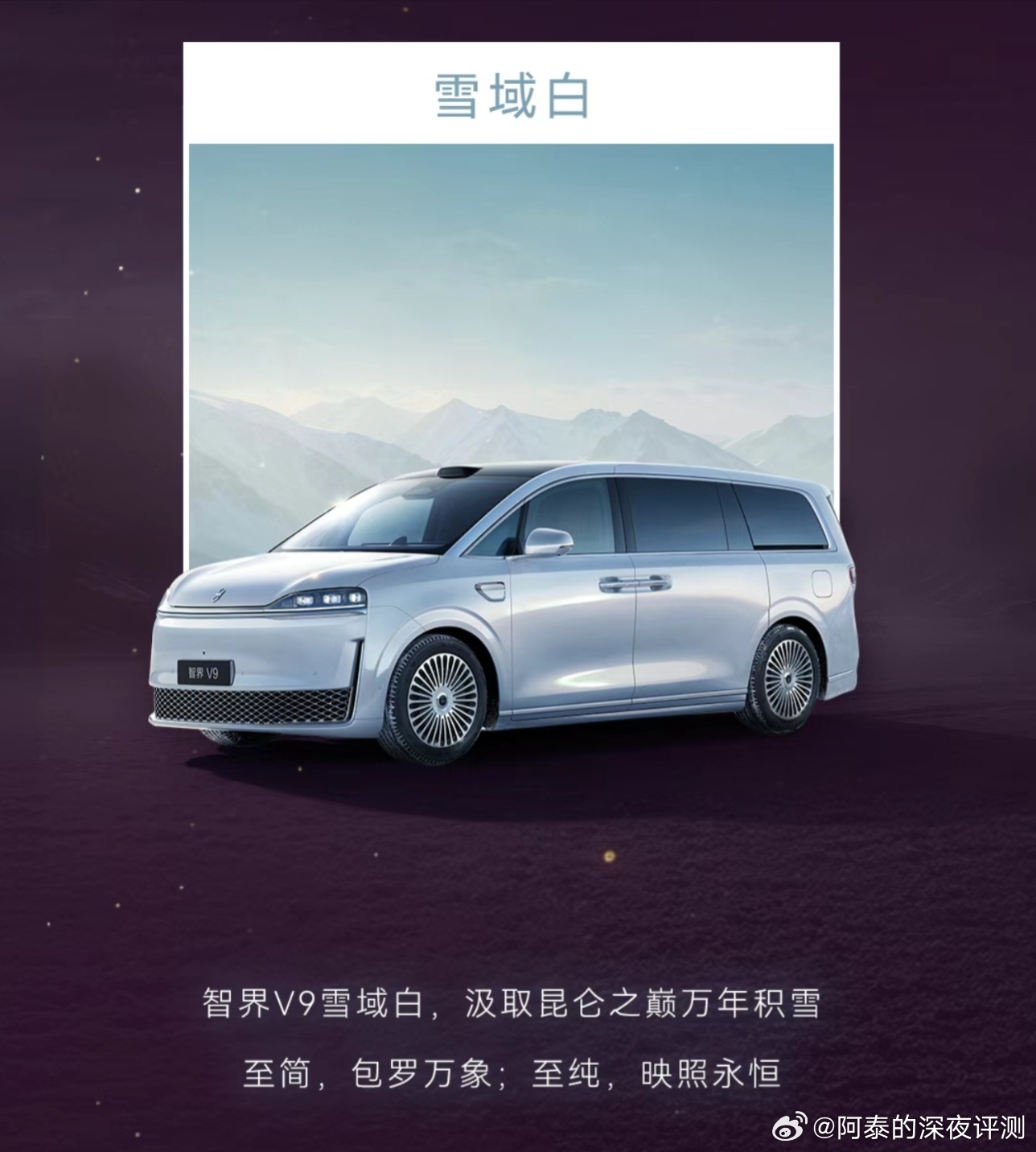 今天余承东正式公布鸿蒙智行首款旗舰MPV智界V9的四款车身配色:辉光紫、深海蓝、雪域白、鎏金黑。感觉几款配合各有特色,大家喜欢哪一个??