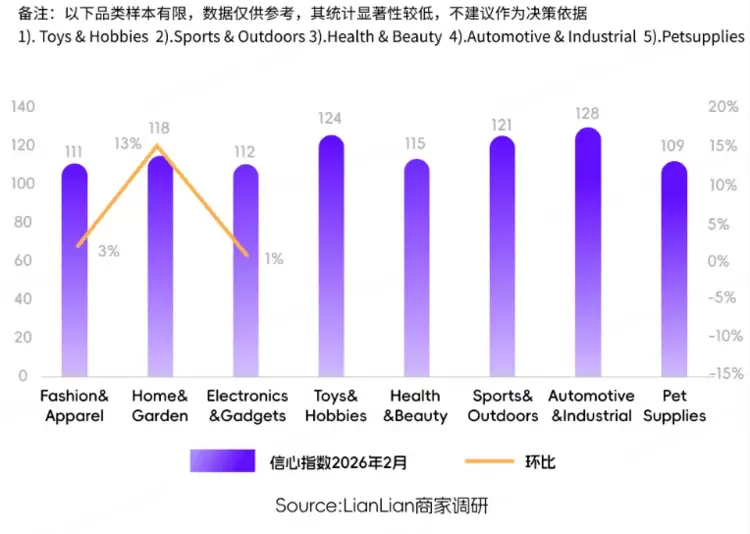 根据商家信心指数的调研数据显示,2026年2月,各品类商家信心呈现全面上升的良好态势,不同品类凭借自身特点和市场需求,展现出强劲的发展动力。