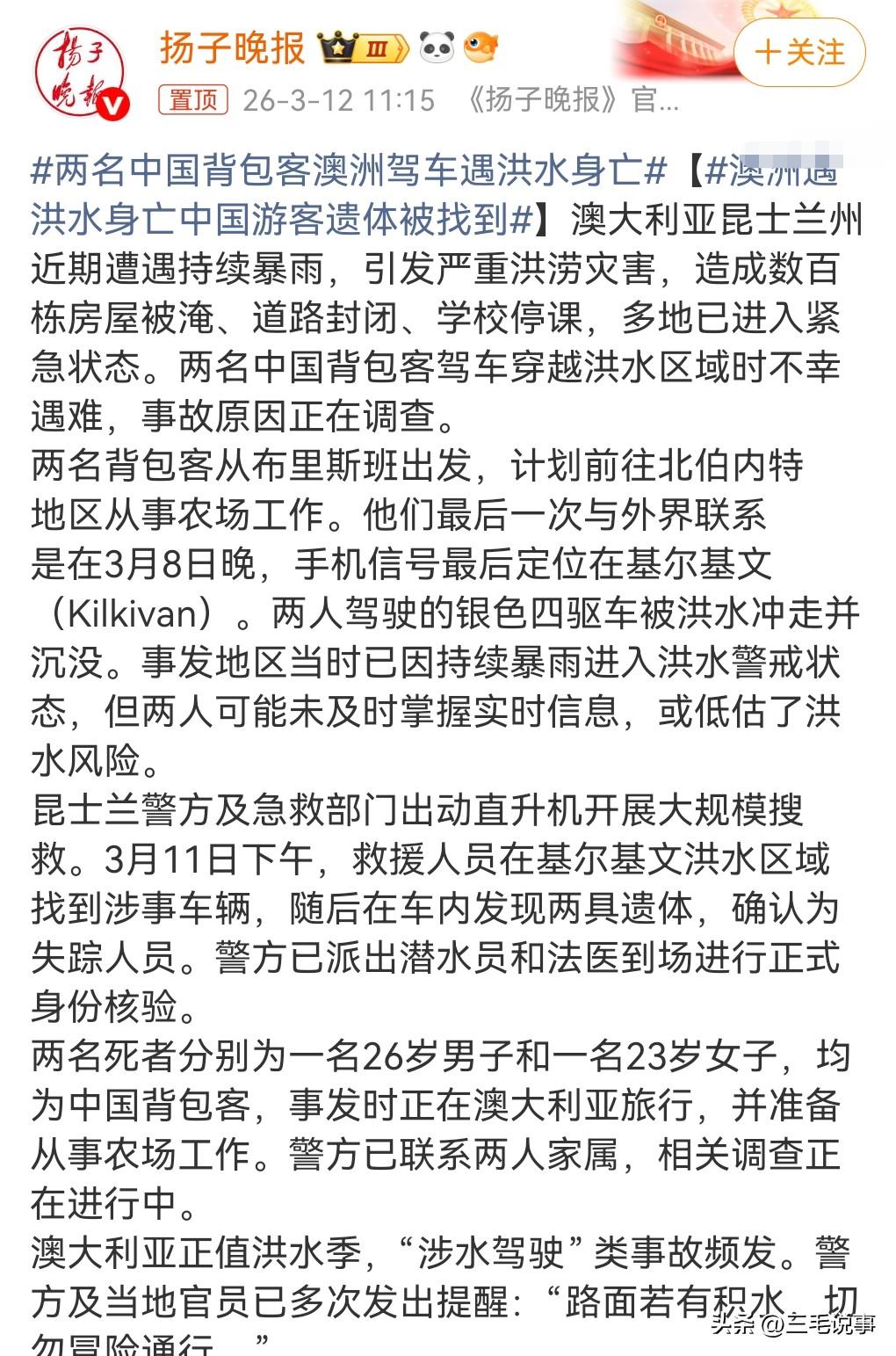 这也是真够惨的,这么年轻竟然死在了异国他乡。 近日,两名中国背包客澳洲驾车遇洪水身亡。 一个26岁,一个23岁,死者为一男一女。 当时当地下了很久的暴雨,引发了洪水。 分析认为,两人未掌握当时的情况,或者是低估了洪水的危险。 这是一个安全意识的问题。如果发现路面有水,那就不要冒险通过。
