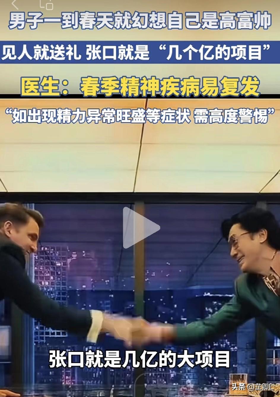 警惕!郑州一男子一到春天就变“高富帅”,往来全是几个亿的大项目。医生:这是病,得治! 河南郑州,一名36岁男子,一到春天就跟“换了个人”似的。 平时就是个普通人,一到春天就开始幻想自己是大老板、高富帅,张口闭口几个亿的大项目,见人就送礼,还到处吹牛说能帮人办大事。 就连面对医生,他都大方表示:“你想干啥我都支持你!” 整个人话特别多、停不下来,精力旺盛得不正常,还乱花钱。 到医院一检查,原来是春季躁狂发作。 医生提醒:春天是精神疾病容易复发的季节。 原来春天不仅仅是万物复苏的季节,连人平常隐藏的想法也跟着复苏了,反差太大,造成了行为紊乱。 所以,如果身边有人突然变得话多、亢奋、乱花钱、行为反常,一定要提高警惕,及时就医! 素材来源:潮新闻,侵联删!