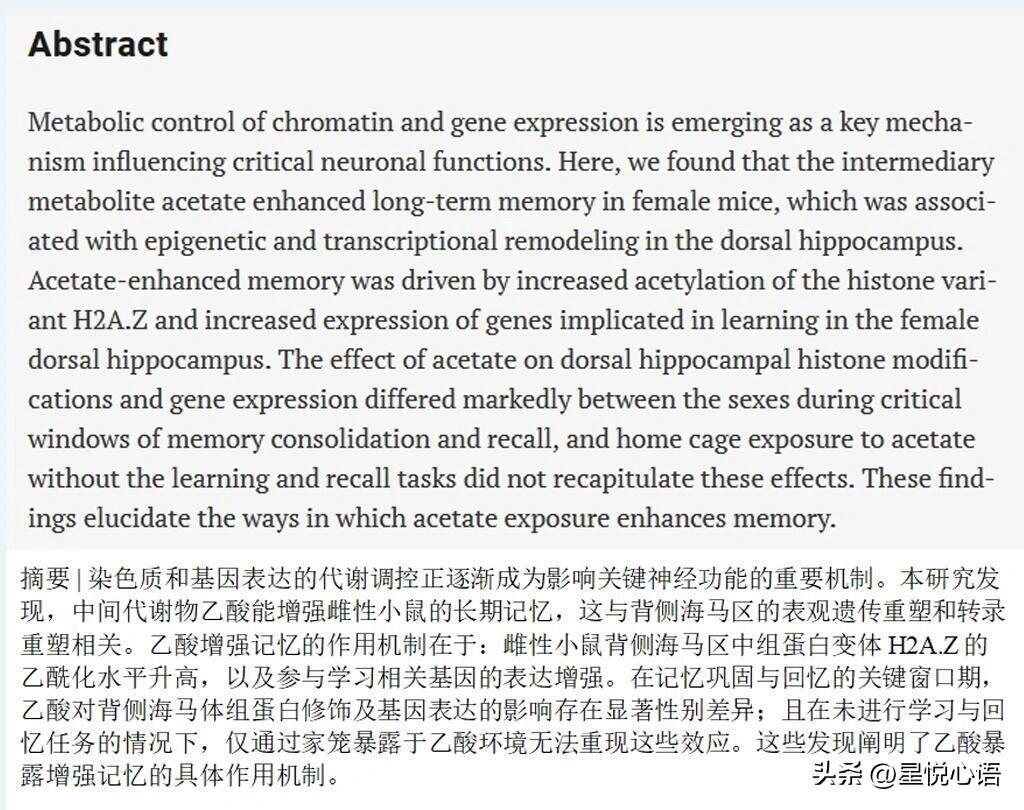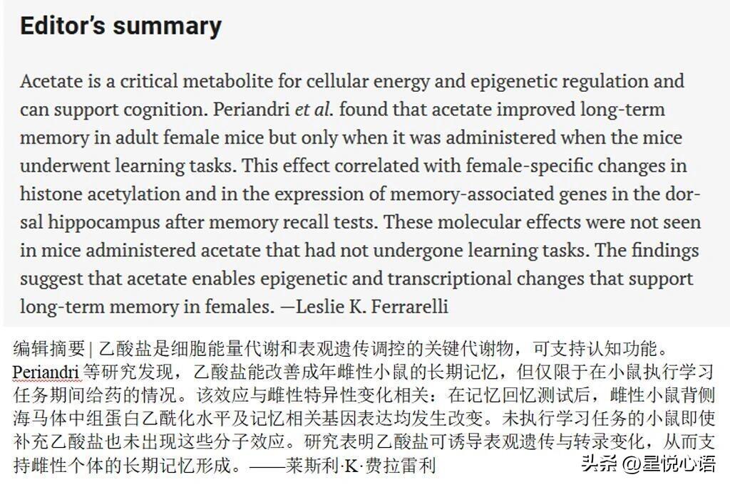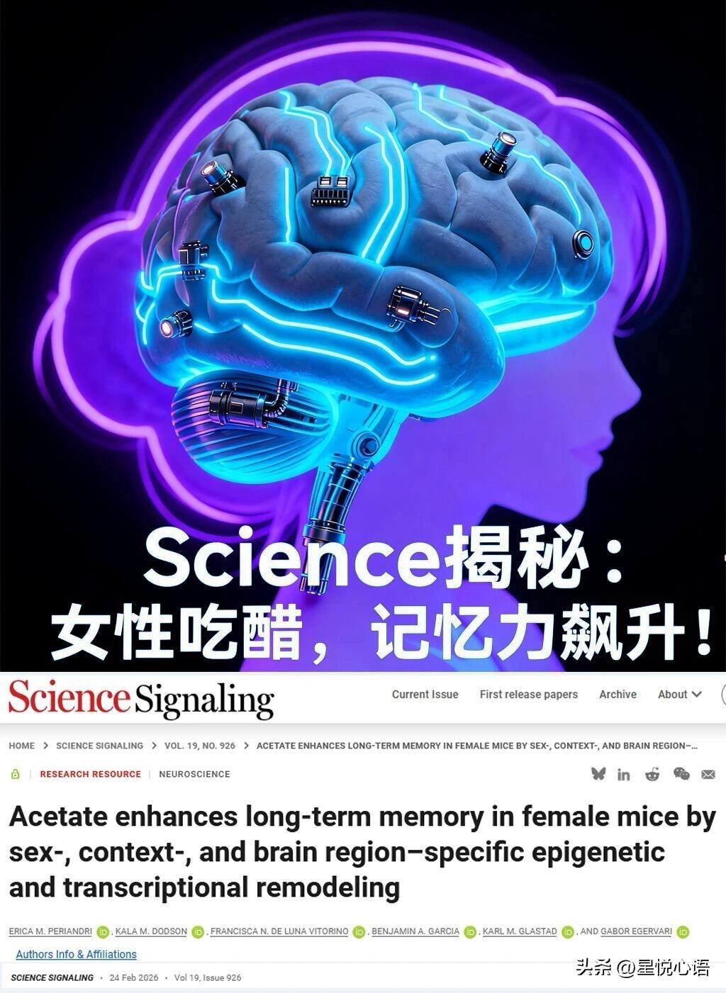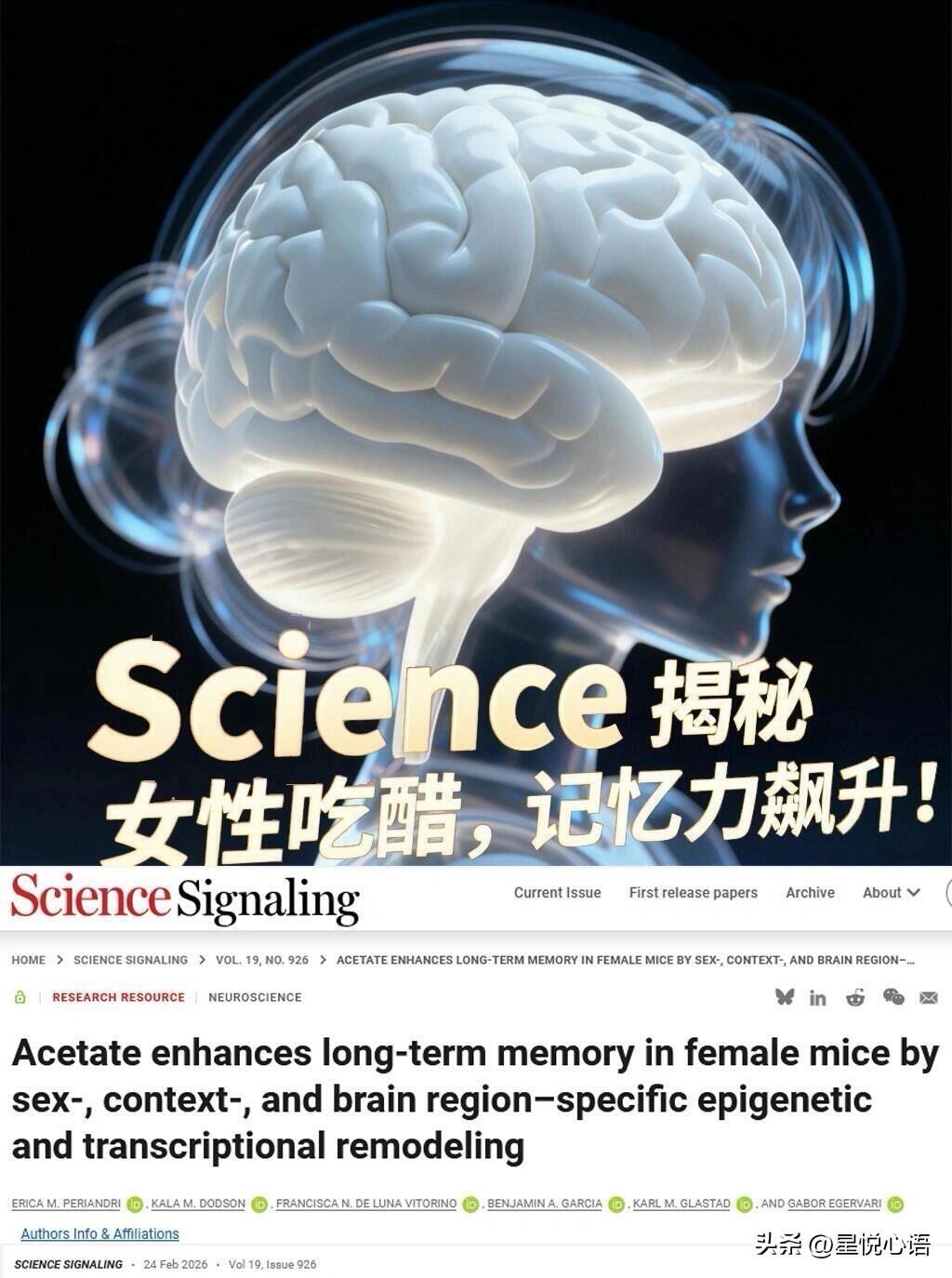 Science实锤!女生吃醋竟能提高记忆力 真的被Science的新研究惊到了!咱厨房天天见的醋,居然藏着女性专属的记忆密码,这波科普必须码住! 醋的核心成分醋酸盐,被研究证实能显著增强雌性小鼠的长期记忆力。实验里补了醋酸盐的雌鼠,对物体位置、新旧识别记得清清楚楚,而雄鼠几乎没变化,妥妥的女生专属福利! 背后的原理超有意思,醋酸盐会像钥匙一样,打开女性大脑海马体的表观遗传开关。让记忆相关的组蛋白乙酰化,激活Nr4a3这个记忆核心基因,直接把大脑的记忆功能拉满。但关键是得边学习边摄入,光吃醋不学,大脑根本没反应。 为啥只有女生受益?因为女性大脑的胆碱能系统更活跃,对醋酸盐的响应更敏感。而女性恰好是阿尔茨海默病的高发人群,这研究直接给认知保护开了新路子,太有价值了! 当然别直接抱醋瓶猛喝,小鼠的剂量换算到人超量会伤肠胃。日常做菜放醋、吃饺子蘸醋,选正规酿造醋适量吃就够。 真的感慨,家常调味品居然藏着这么大的健康门道,代谢影响大脑远比我们想的直接。以后吃醋都多了份仪式感,期待后续人类研究,咱普通人靠小饮食就能护认知,也太香了!
