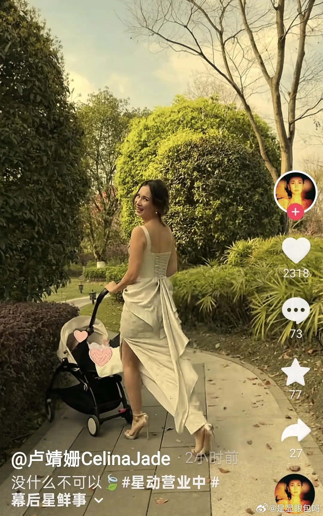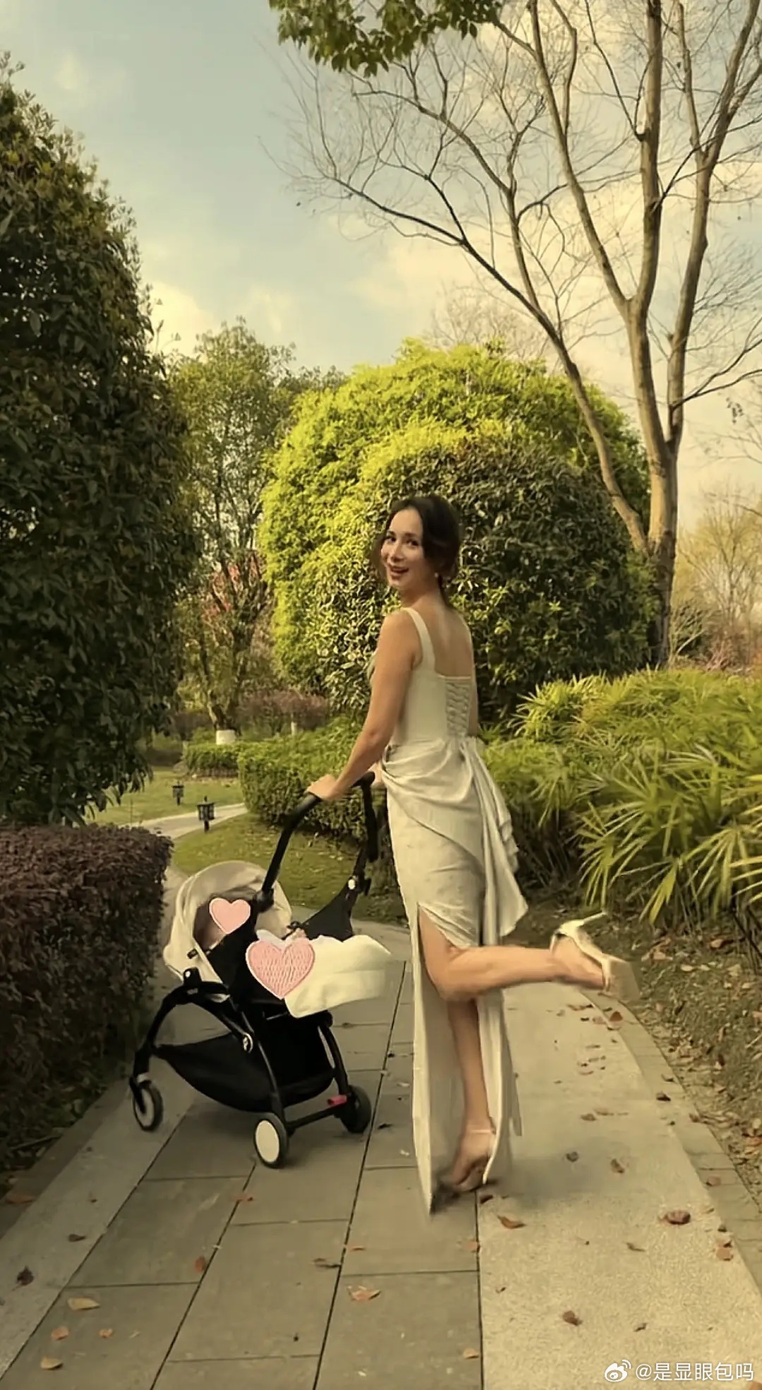 卢靖姗晒溜娃照,穿银色礼服配高跟鞋推婴儿车,二胎儿子好乖。(芒果捞小萌主)