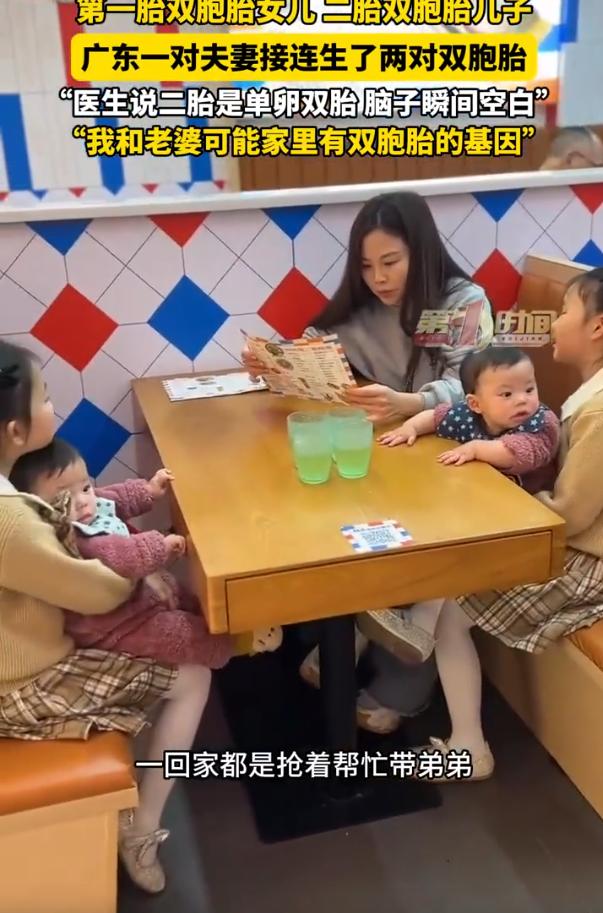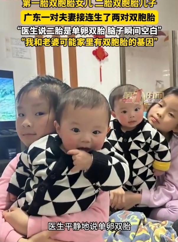 “这比中彩票都难!”广东韶关,一对夫妻生下了一对双胞胎,孩子上学后,夫妻俩想着再要一胎,结果第二胎又是个双胞胎,当医生把结果告诉男子后,当时他整个人都懵了,没有幸福,没有压力,就是一片空白 黄先生介绍,自己和妻子的头胎是双胞胎,现在都已经8岁上二年级了,到了第二天去医院做检查,医生平静的告知是单卵双胎,可他听到后心里却平静不了了 他说那一刻自己是说不上来的情绪,不是激动,也不是开心,就是单纯的发懵,孩子生下来时,啥压力都忘了,就觉得腿软,现在就有压力,也有动力,就连医生都说这种概率真的不高 当然,这可能也和夫妻二人的家庭基因有关,黄先生的堂姐就生下了双胞胎,而妻子的姑姑也是生下了双胞胎 有网友说:别的不讲,这是修来的福气先苦后甜,期待四个孩子健康快乐! 这话说的没错,这事要是放普通人身上,估计比中彩票还让人发懵。彩票中了顶多是钱怎么花的问题,这二胎双胞胎一落地,直接是房子怎么住、学费怎么交、四个娃打架怎么劝的连环考题。这位黄先生当时腿软的反应,太真实了,那种感觉不是喜悦,是人生剧本突然被改写的茫然 但细想,这其实也是生活最实在的甜蜜负担。四个孩子,未来二十年的鸡飞狗跳、热闘程度、操心指数都是几何级增长 可等到过年过节,别人家冷冷清清,他们家直接凑一桌麻将还有替补,那种人丁兴旺的热乎气,是多少钱都换不来的 说到底,日子不就是过个人气嘛。四个娃,四个宝贝,虽然累是真累,但福气也是实实在在的双倍双倍再双倍