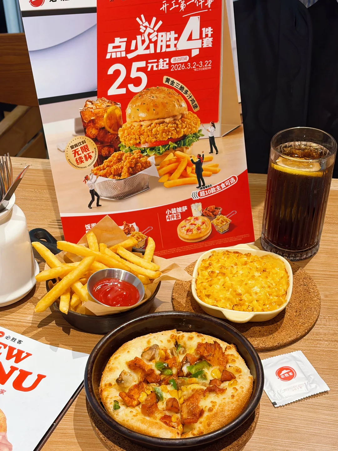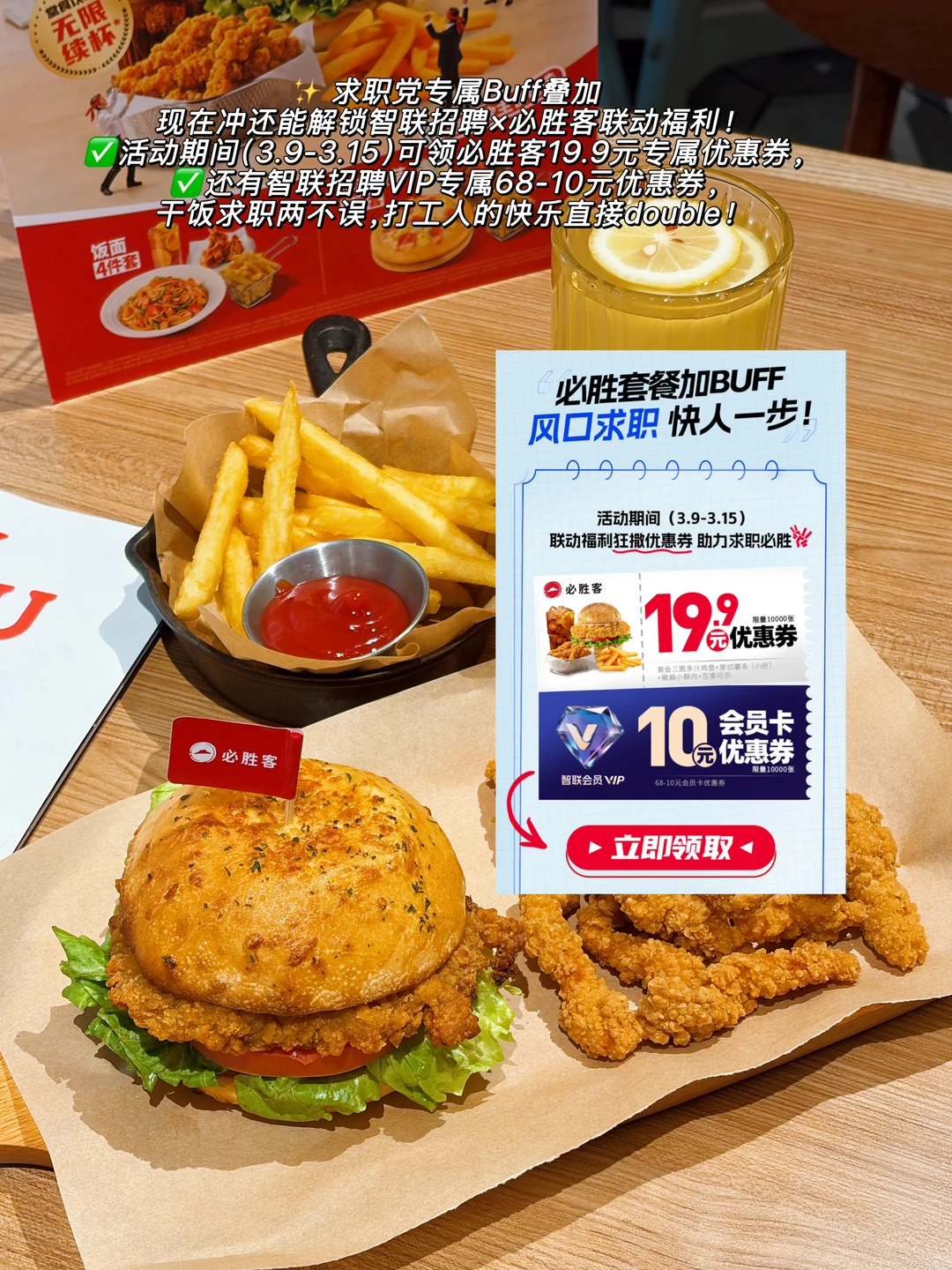 大家快来抄作业!打工人终于不用再纠结“中午吃啥”啦! 最近挖到他们家全新一人食活动,直接放弃外卖凑单,连吃4天, 从披萨到汉堡再到焗饭,每天换着花样来, 好吃不贵,25r就能get主食+小食+饮料,性价比真的超出预期。 ✅ 25r必胜汉堡4件套 黄金三脆多汁鸡堡 + 厚切薯条+ 椒麻小酥肉 + 柑橘柠檬水 超爱他们家汉堡,全都是现点现做的,比萨面包外脆内软,大块鸡排手工裹粉,一口下去外脆里嫩爆汁到飙汁;一口集齐鸡排脆、面包脆、生菜脆,加上绵密芝士酱,三重脆感一口封神!搭配椒麻香酥小酥肉和柑橘柠檬水,25r的满足感谁懂! ✅32r必胜披萨4件套 德克萨斯风味烤肉披萨+ 厚切薯条+ 经典原味芝士挞 + 百事可乐 烤肉披萨的肉香浓郁,芝士拉丝感十足,奶香裹着肉香,再搭配酥脆的厚切薯条和奶香的芝士挞,碳水+肉肉+甜品的快乐,谁吃谁知道。冰可乐一冲,直接解锁双倍满足。 ✅29r必胜饭面4件套 新奥尔良式鸡肉意面 + 厚切薯条+ 芝士焗黄金甜玉米粒 + 武夷水仙大红袍茶饮 意面裹满了浓郁的酱汁,鸡肉嫩咸香入味,建议把薯条和芝士焗玉米粒直接拌着一起吃,真的夯爆了,口感层次超丰富。最后来杯大红袍茶,回甘悠长,吃完超舒服。 ✅ 38r必胜披萨4件套 新奥尔良风情烤肉披萨 + 厚切薯条+ 椒麻小酥肉 + 柑橘柠檬水 是我最爱的烤肉披萨,铁盘小装一人食份量刚好!饼底松软有嚼劲,新奥尔良烤肉香浓郁带点微甜,芝士拉丝感十足,每一口都能吃到肉香和奶香。一整套套餐吃下来饱到扶墙! 💡打工人专属薅羊毛攻略 4件套的价格真的太顶了,其他披萨店的随随便便一个单点就得30起步,但是在必胜客25r起,就可以点到4样东西,汉堡、披萨还有十几种主食,口味随便挑,连吃一周都不带重样的! 堂食福利:到店吃就能享饮料无限续杯,饮料钱都省了,打工人幸福感拉满。 现在冲还能解锁智联招聘×必胜客联动福利!活动期间(3.9-3.15)可领必胜客19.9元就能拿下4件套,还有智联招聘VIP专属优惠券,干饭求职两不误,打工人的快乐直接ble! 必胜客这波一人食活动,真的把打工人的需求拿捏得死死的。省钱又好吃,建议大家3月冲一波,反正我的午饭已经被它承包了~