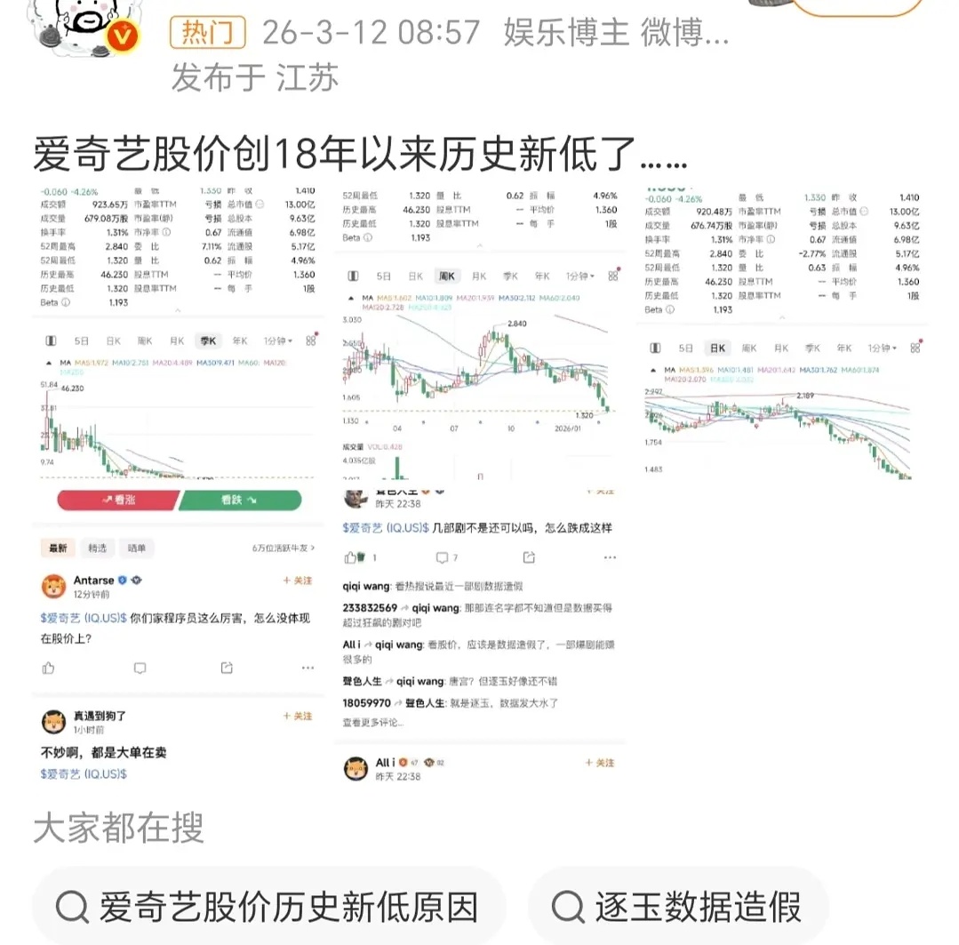 你的股票暴跌了,而且是18年以来历史最低。真爆剧会拉升股票的,现在暴跌只有一种解释,贵司出现了重大信任危机。数据造假,股民大量抛售。爱奇艺回应逐玉数据真实性