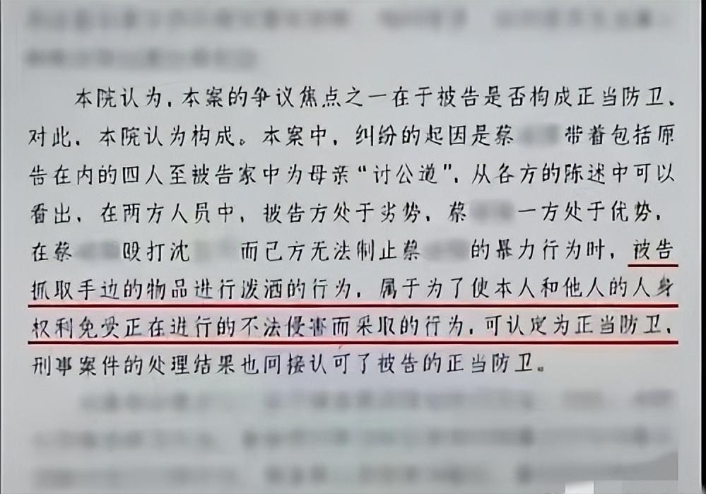 上海,一外甥带5人上门,对舅舅进行围殴,舅妈激愤之下,拿起一瓶强腐蚀性液体,直接泼向一男子,男子当即痛苦惨叫,连滚带爬逃跑,事后男子全身20%被烧伤,造成10级伤残,舅妈也被刑拘,可舅妈认为是正当防卫,法院2次判决亮了!二审判决撤销一审判决,驳回陈子昂的全部诉讼请求。 2017 年 7 月的傍晚,上海浦东新区一栋自建小楼里,饭菜的香气还飘在屋内,施女士一家四口刚围坐到餐桌旁,平静的日常就被一声剧烈的踹门声击碎。 铁门被强行踹开后,外甥蔡某带着五名陌生男子径直闯入,原本温馨的居家场景,瞬间被紧张与暴力笼罩。 这场冲突的根源,是家中老宅的拆迁款分配问题,施女士的丈夫与姐姐此前就两百余万元补偿款的归属多次争执,即便经过基层调解,矛盾也只是暂时搁置,并未真正化解。 一行人闯入后没有任何沟通,直接对施女士的丈夫实施围殴,施女士上前阻拦时也遭到殴打,鼻梁骨折、面部多处受伤,家中的老人和孩子也被控制住,无法脱身。 屋内空间狭小,外来人员人数占优,殴打行为持续发生,家人的安全处在紧迫的危险中。 施女士在慌乱与激愤中,随手抓起身边装有强腐蚀性液体的容器,朝着正在实施侵害的男子泼去,液体接触皮肤后迅速造成损伤,被泼中的男子当场发出痛苦的叫喊,随即连滚带爬地逃离现场。 经司法鉴定,该男子全身约 20% 面积烧伤,构成十级伤残,施女士因涉嫌故意伤害被警方刑事拘留。 案件进入司法程序后,检察机关经审查认为,施女士的行为是为制止正在进行的不法侵害,符合正当防卫的构成要件,依法作出不起诉决定。 但受伤男子并未就此结束,转而向法院提起民事诉讼,要求施女士承担经济赔偿责任。 一审法院审理后认为,施女士使用腐蚀性液体防卫造成严重后果,构成防卫过当,判令其承担一定比例的赔偿责任。 施女士对一审判决不服,认为自己是在家人遭受非法侵入与暴力殴打时的自保行为,坚持提起上诉。 上海市第一中级人民法院受理上诉后,对全案事实与证据进行全面核查。 法院查明,蔡某纠集多人擅自闯入他人住宅,本身已构成非法侵入住宅,同行人员虽未直接实施殴打,但参与控制施女士家人,属于共同不法侵害。 侵害行为具有突发性、持续性与暴力性,施女士身处家中,面对多人围殴与家人受困的紧急局面,没有时间与条件选择更缓和的防卫手段,其随手取用身边物品反击,是出于保护自身与家人安全的本能,防卫意图纯粹,没有报复或挑拨的主观故意。 法院同时认定,施女士在侵害人逃离后立即停止行为,防卫行为的强度与手段,均与不法侵害的危险程度相适应,没有超出必要限度。 一审判决未能完整考量侵害行为的整体性与紧迫性,适用法律存在偏差。二审法院最终作出判决,撤销一审民事判决,驳回受伤男子的全部诉讼请求,明确认定施女士的行为属于正当防卫,无需承担民事赔偿责任。 这起发生在家庭住宅内的防卫案件,历经两次审理得出截然不同的结论,二审判决立足正当防卫的立法本意。 充分尊重公民在住宅安宁与人身安全遭受紧迫侵害时的防卫权利,清晰界定了非法侵入与共同侵害的责任边界,也为同类涉家庭防卫、邻里冲突案件的审理提供了明确参照。