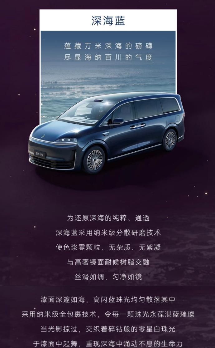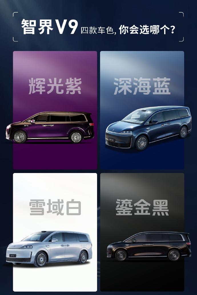 刚刚注意到余承东正式公布了智界V9的四款车身配色:辉光紫、深海蓝、雪域白、鎏金黑。 这4个颜色的灵感全部取自壮阔的自然奇景,比如辉光紫,捕捉的是太平洋日落时分海天一色的那一瞬间。为了让质感呈现到位,车身漆面历经超百道精密工序与纳米研磨工艺打磨,实际效果会非常值得期待。 但颜色只是开胃菜。 真正值得关注的,是智界V9这次打出的定位——“MPV科技车皇”。 什么叫“车皇”?不是尺寸最大、不是沙发最软,而是把当前能拿出来的顶级技术,一次性堆满。 先看底子。智界V9将搭载雪鸮智能增程系统,同时配带预瞄的途灵底盘,还有双腔空气悬架和后轮转向。续航、底盘舒适度、驾驶的灵活度都有了保证。 座舱是这次释放信息比较多的部分。从官方发布的内饰图来看,二排用的是真双零重力座椅,支持45度、90度和180度多角度旋转。这意味着商务接待时可以转过来面对面会谈,家庭出游也可以有更多种玩法。加上车载氧吧、恒温冰箱、后排超大吸顶屏这些配置,确实把“移动会客厅”那个味儿做出来了。 智慧座舱自然是最新一代鸿蒙系统,智驾将会使用全新一代华为乾崑智驾硬件,其中最关键的是前几天才发布的华为896线激光雷达。感知能力有了质的飞跃,系统看得更远、更细、更准,预计会拉高MPV智能化的上限。 作为鸿蒙家族的第一款MPV,智界V9可以说严阵以待。华为和奇瑞都掏出了自己的家底,动力总成、底盘、智驾、座舱,甚至是颜色都精益求精。MPV这个品类,过去靠的是空间和舒适,接下来可能真的要加上一个词——科技。