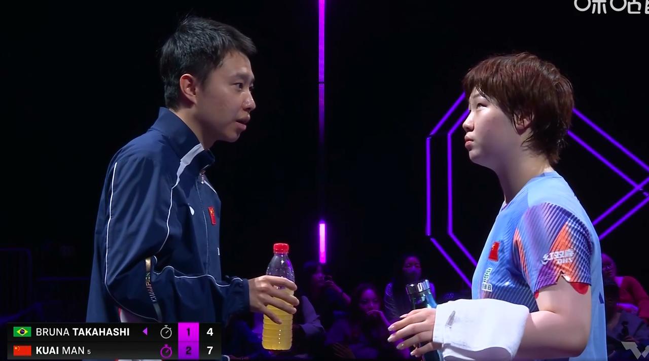 打完重庆冠军赛, 于子洋大概率是蒯曼的主管教练了。 这次于子洋指导蒯曼也很棒。 前两局 蒯曼2:0领先, 第三局 蒯曼看到希望后, 手紧了, 突然不吃高桥发球了, 被高桥12:10逆转。 第四局 经过于子洋调整, 蒯曼找回来状态, 4:0开局, 7:2领先。 11:7拿下。 最终3:1战胜了高桥。 于子洋给蒯曼做了2次现场指导, 蒯曼打的都不错, 大概率会是蒯曼主管教练了。 但是于子洋给陈熠做了3次现场指导, 陈熠打的也不错, 这是一点变数。