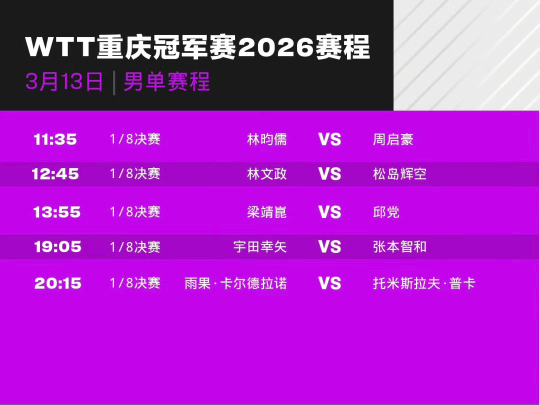 WTT重庆冠军赛2026 3月13日赛程