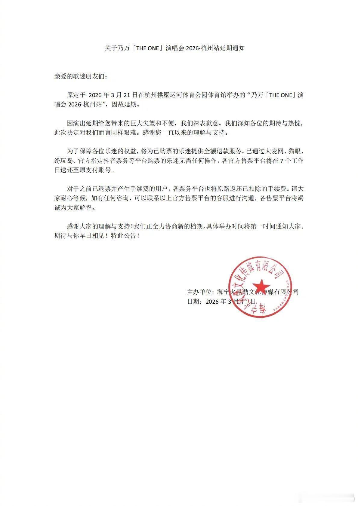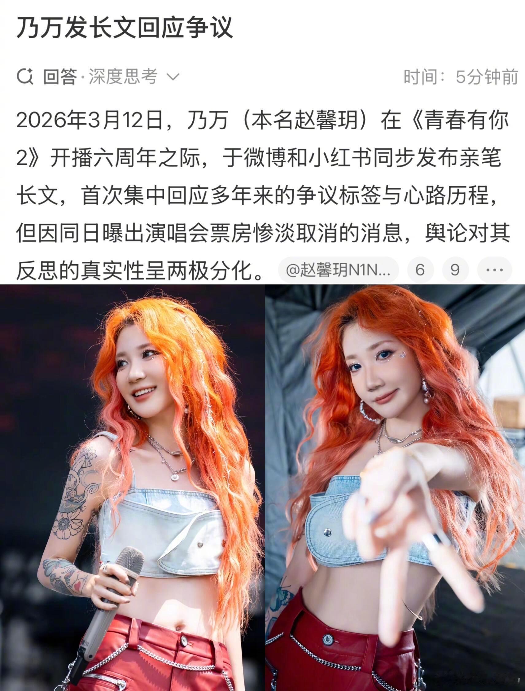 乃万发长文回应争议乃万杭州站演唱会因为票卖得不理想所以延期取消了,所以网友觉得乃
