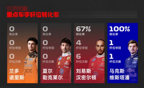 在过去的中国大奖赛中,汉密尔顿6次夺得杆位,其中4次转化为胜利,杆位转化率67%,维斯塔潘在2024年拿到了在中国站的首个杆位并最终夺冠,而勒克莱尔和诺里斯暂时还未能在中国站取得杆位。