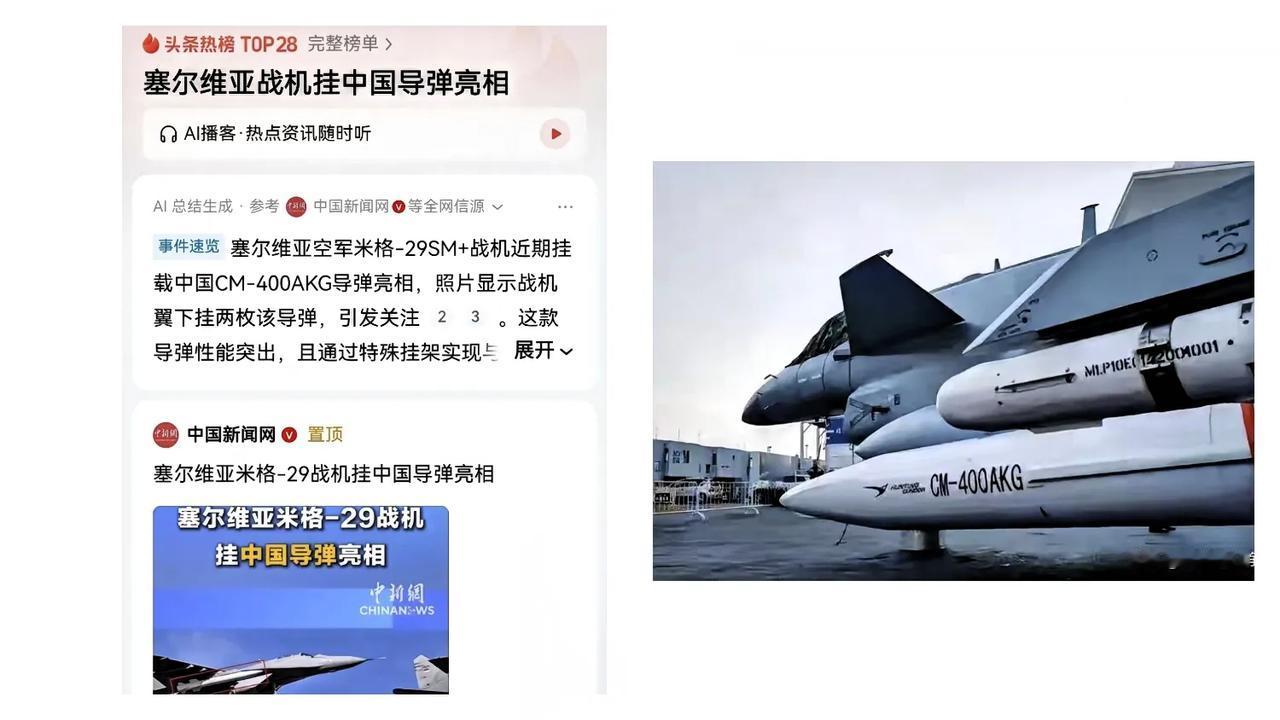 最近有一条消息,火遍了西方所有的军事刊物 塞尔维亚米格-29挂着中国CM-400AKG导弹亮相,直接成了欧洲首款机载超音速利器,这波操作让欧美彻底坐不住了。 这款导弹重910公斤,末端速度4.5马赫,射程250公里,既能反舰也能对地,目前只有巴铁和塞尔维亚采购。最绝的是中国军工的“留余”智慧,公开参数永远带个“以上”,4.5马赫余多少?250公里余多少?西方猜破头也摸不准,这才是无形的威慑力。 它不用大改战机就能适配,老飞机直接焕发新生,西方反导系统根本拦不住。与其说卖装备,不如说中国输出的是一套低成本、高战力的解决方案。 这种“话不说满、力不使尽”的套路,印度早吃过亏,现在轮到欧洲人头疼了。