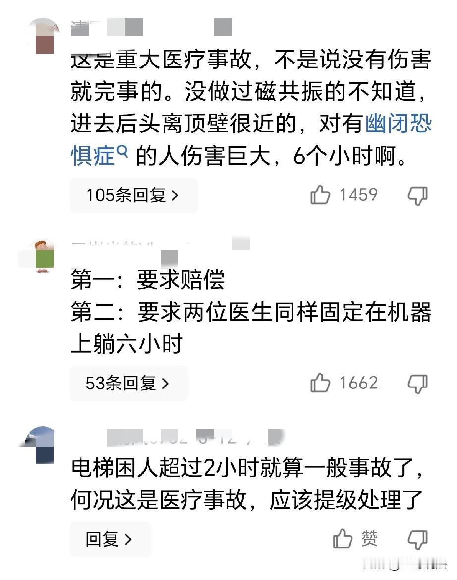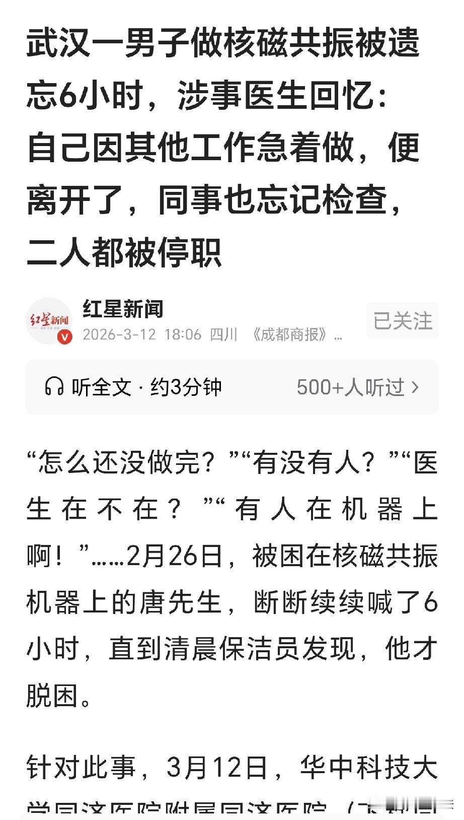 “还是天使吗?”湖北武汉,一男子因颈部疼痛,到医院做核磁共振,轮到他时已经是凌晨0时,男子躺上去之后,医生给他罩上面罩,固定住头部,手机搁在了桌上,开始做核磁共振,谁知医生有事走了,竟然把他忘到了机器里面,男子被困6个小时,呼天天不应,叫地地不灵,直到凌晨6点,男子听到了动静,他大声呼救,这才来人给他解开,妻子报警,可就诊记录上却显示,男子在凌晨0时10分就已做完了检查。 唐先生经历了一场危机,他至今想起都心有余悸,他在医院里被困在核磁共振机器里6个小时! 原来,唐先生颈部疼痛,他在一家医院里预约了核磁共振,他就想看一看自己的脖子到底有啥问题,这样医生就能给他对症诊治。 2月25号晚上10点左右,唐先生在医院叫号,一直到2月26号的凌晨0时许,他才躺进了检查室的核磁共振机器上。 他才进门时,把手机拿了出来,随手搁在了检查室窗边的桌子上。 随后他按照医生的指示,躺到了核磁共振的机器里面。 随后医生过来,给他固定住了头部,又给他脸上罩好了面罩,之后就开始做核磁检测,轰鸣声在他耳边不断着响着。 唐先生等了半个小时,可是还没有等到医生来给他解开头部,他有点急了,连忙大喊: 怎么还没做完? 可奇怪的是外面竟没人回答,医生不知道干啥去了,唐先生接连喊了多次: 有没有人?l 医生在不在? 有人在机器上啊! 而令他绝望的是竟然没一个来解开他。 唐先生又急又怕,他不知道究竟发生了什么,给他做检查的医生去哪里了?医生咋可能把病人就这么扔下了? 唐先生害怕了,他想自己出来,可是机器还在轰轰作响,他又不敢动了,他只有大声的喊人,可是始终没人来检查室。 他就这样喊累了歇歇,接着再喊,一直喊了6个小时,一直到凌晨的6点,他终于听到外面有了动静。 唐先生又急又气,他又大喊大叫,这时工作人员赶来,这才把他给解救了下来。 唐先生下来才知道,刚才听到响动是保洁员,保洁员早早来打扫卫生,这才听到了他的呼救声。 保洁员又去叫来了保安,保安这才把他放了下来。 在唐先生被困期间,妻子看他迟迟没有回家,电话也不接,妻子急匆匆赶到了医院。 可她到医院一看,也没见唐先生,她害怕了,赶忙拨打了报警电话。 警方赶到后调取了监控,可奇怪的是,监控里并没有看到唐先生的人。 可保安交给警方的就诊记录上却显示凌晨0点10分唐先生就做完了检查。 这就奇了怪了,既然检查已经做完,那唐先生究竟去了哪里?妻子急的直抹眼泪,一直到唐先生被放出来后,妻子才知道他被困在了核磁共振的机器里面。 妻子心疼大哭,担心这一晚上机器没停,会不会给唐先生的身体造成影响。 事后,医生说出了真相,她把唐先生固定好之后,因为还有别的工作着急要做,她在系统上写了检查已经完成。 她走的时候,叮咛了同事,说唐先生还在机器里面,可是她也没有想到,同事疏忽,临走时竟然忘了。 就是因为她俩的疏忽,导致唐先生被困了6个小时,唐先生受到了惊吓,想起来就难过的不行。 直接,医院开会整顿,两位医生被停职,医院给唐先生做了检查,唐先生的身体并没有受到影响。 有人说了,这是重大医疗事故,不是说没有伤害就完事的,没做过磁共振的不知道,进去后头离顶壁很近的,对有幽闭恐惧症的人伤害巨大,6个小时啊。 也有人说,换成我,能吓死在里面,以前做过核磁共振,舱内地方小导致心情紧张忐忑不安的,十分钟我就像受刑一样,别说六个小时了,真的不敢想象。 更有人说,做过头核磁,机器轰隆隆的响了大概15分钟,那种窒息感,又没有手机,不能和外界联系,真的怕被忘记在机器上面,没想到真的会发生,太绝望了! 医院已经给唐先生道歉,但是对于赔偿金额没有达成一致,医院要唐先生去法院起诉。 《民法典》1218条规定,患者在医院治疗期间受到损伤,只要医院或者医护人员有过错,医院必须全额赔偿。 涉事医生把唐先生固定在机器上就离岗,还违规在系统里标记了检查已完成。 后续接手的同事也没有检查机器上有没有人,两人的失误凑到一起,完全属于工作失职,医院必须承担责任。 《民法典》1222条规定,医院违反诊疗规范操作,可以直接认定为有错,不需要患者额外举证。 唐先生被困6小时,本质就是医院没有遵守检查收尾的核对流程,不需要再纠结医院是不是故意的,只要出错了就必须担责。 除了道歉,唐先生还可以索要精神损害赔偿,6小时的恐惧和绝望属于实实在在的精神创伤。 唐先生有权去做全面体检,这笔费用也该由医院承担。 对此,你怎么看?