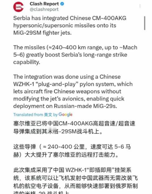 塞尔维亚受刺激了!塞尔维亚成为了欧洲首个列装中国超音速空射导弹的国家!塞尔维亚紧急将中国CM-400AKG高超音速导弹集成到其米格- 29战斗机上。3月11日,根据外媒报道,就在中东局势紧张之际,塞尔维亚紧急将射程240-400公里,速度高达~ 5-6马赫的CM-400AKG高超音速集成到了米格- 29战斗机了。外媒称,这一挂载将极大地增强塞尔维亚的远程打击能力。 且看塞尔维亚空军实力如何,其现有14架米格 - 29战机,4架为南斯拉夫遗留的老旧型号,6架是俄罗斯慷慨赠予,还有4架经白俄罗斯翻新而来。 这些老旧飞机的雷达探测范围极为有限,仅不足100公里,在空战领域,如此性能使其空战能力早已滞后于时代发展,难以适应现代空战需求。 中国军工巧用“外挂神器”,无需对飞机大幅改造,仅加装智能挂架,连接导航、火控计算机与供电系统,米格 - 29 便能发射 CM - 400AKG,展现出非凡的创新智慧。 这方案成本只有传统改装的十分之一,却让老飞机获得250公里外精准打击能力,相当于给老手机装了个新APP,瞬间变智能。 CM - 400AKG导弹威力慑人,其运用惯性与北斗卫星联合制导,临近目标时切换红外成像,打击精度超凡,误差不逾5米,能精准摧毁防空雷达、指挥中心,甚至是军舰。 5到6倍音速的冲刺,让现有防空系统根本拦不住,拦截成功率不到15%。 塞尔维亚现在有了"防空-对地-反舰"三件套:FK-3防空系统守住200公里天空,以色列"脉冲"火箭炮覆盖地面,CM-400AKG则延伸到400公里外。 这不对称的威慑之力,宛如强劲东风,助力塞尔维亚在科索沃问题的困局中实现逆袭,使其得以在这一复杂局势中彻底扭转乾坤。 2022年科索沃危机时,塞军战机没精确武器,生存率不到30%,现在却能"防区外打击",对方还没看见飞机,导弹已经砸过去了。 身为欧盟候选国,塞尔维亚却选中中国导弹,此中门道颇深,这背后或许藏着地缘政治、军事需求等多方面的权衡与考量,个中究竟,着实值得深入探究。 塞尔维亚坚持不站队,买法国"阵风"战机被阉割,买俄罗斯S-400又挨西方制裁,最后选了中国的FK-3防空系统和CM-400AKG导弹,既躲开了地缘政治风险,又提升了战力。 这种"东边不亮西边亮"的采购模式,给全球中小国家打了个样,巴基斯坦已经用CM-400AKG击毁印军S-400雷达,阿尔及利亚、缅甸等用俄制战机的国家也在测试适配方案。 塞尔维亚这次"闪电手"操作,不仅是军事升级,更是战略智慧的体现。 在北约东扩的大背景下,塞尔维亚用中国技术实现"低成本高效率"的国防现代化,既维护了战略自主,又避免了直接对抗。 于中国而言,CM - 400AKG的成功适配,不仅验证了军工技术的普适性,还开辟了百亿美元级的广阔市场,更有力地打破了欧美在军贸领域的长期垄断。 不过,这种非对称战力升级也可能让北约加强在巴尔干的军事部署,塞尔维亚得在增强国防和避免冲突间找平衡。 中国则应继续推动军事技术创新与合作,用"守正创新"的智慧维护地区稳定,历史终将证明:真正的安全不在于武器堆砌,而在于战略智慧与和平诚意。 当塞尔维亚的米格-29划破夜空,世界看到的不仅是一款导弹,更是一个大国对"铁杆朋友"的承诺。 在变乱交织的国际局势中,中塞携手走出的,是一条守望相助、共同发展的新路子。