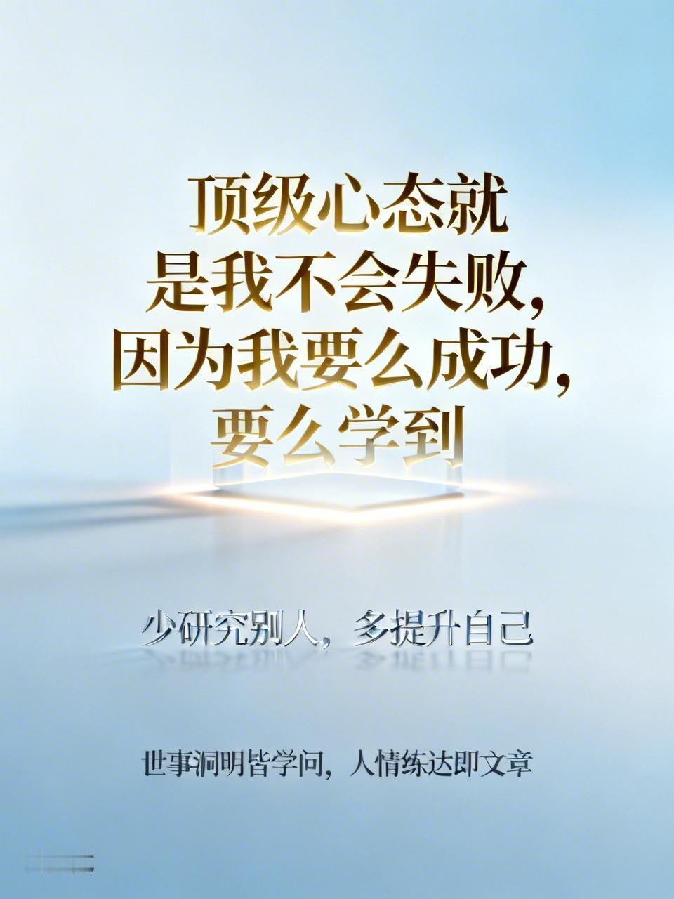 今天读到《人民日报》的超燃金句,太有力量了。“顶级心态就是我不会失败,因为我要么成功,要么学到”,这心态太绝了,失败了也能当作进步,做啥都不白搭。还有“少研究别人,多提升自己”,确实,与其花时间琢磨他人,不如提升自己实力,用知识和稳定情绪给自己撑腰。 “世事洞明皆学问,人情练达即文章”也点破了高级学问在人间,要懂规律、知人心。不做书呆子式清高,也不做功利型精明的人,把生活过成修行,这才是成长啊。