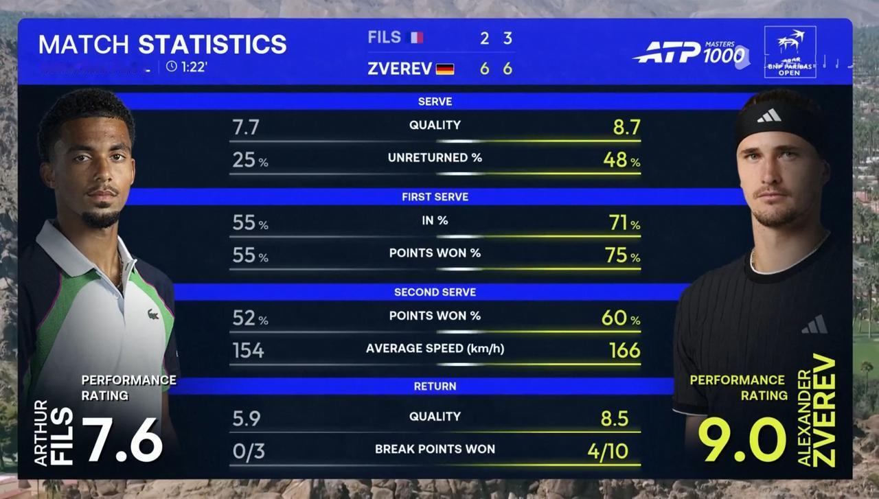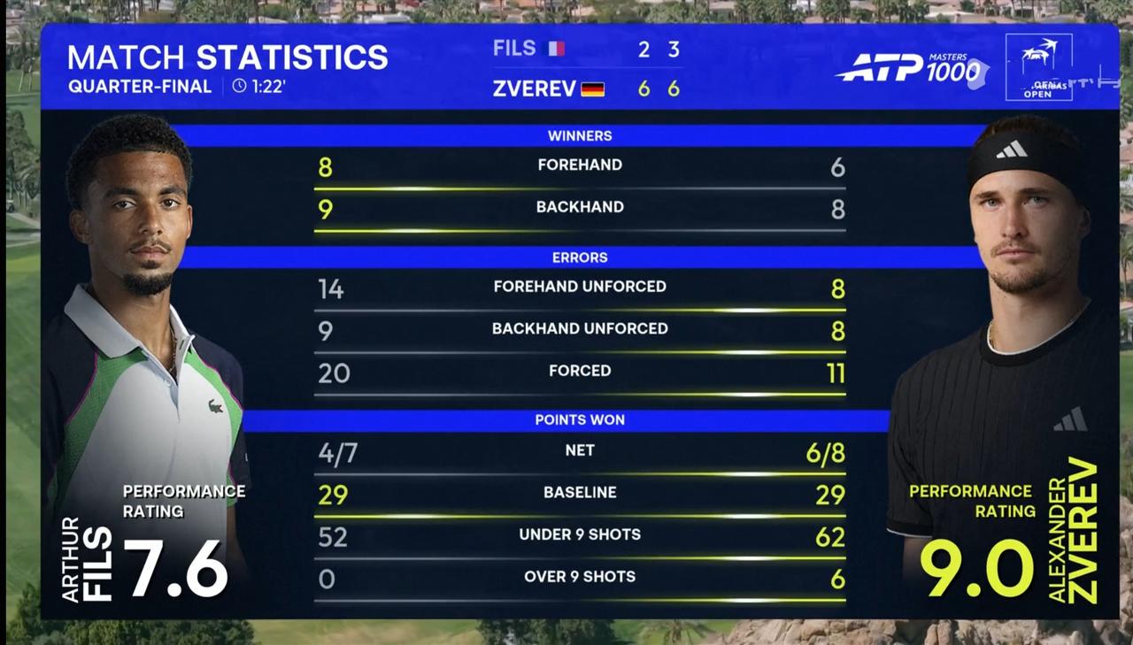 兹维列夫印第安维尔斯大师赛1/4决赛轻取新生代菲斯,与辛纳会师半决赛 北京时间2026年3月13日凌晨,印第安维尔斯大师赛1/4决赛,德国名将兹维列夫对阵法国新生代菲斯。 结果,兹维列夫以2:0的比分轻取菲斯,闯进四强。 具体比分为6:2、6:3。 第一盘。一上来,兹维列夫连破带保取得2:0领先。第五局,兹维列夫在对手握有一个局点的情况下追平比分并拿到破发点,最终,经历五次平分,化解四个局点,在第二个破发点上兑现破发。4:1。第八局,兹维列夫发球胜盘局 ,在握有连续两个局点的情况下,被追平比分,随后连拿两分,成功保发。 6:2,兹维列夫先下一城。 第二盘。前四局各自坚守住自己的阵地。转折点发生在第五局,兹维列夫逼出连续两个破发点,随即兑现破发,3:2。第九局,菲斯退无可退发球局,被逼出连续两个破发点,挽救一个破发点后,随即遭遇破发。 6:3,兹维列夫再下一城。 大比分2:0,兹维列夫完胜菲斯,晋级四强。 这是兹维列夫首次挺进该赛事四强。 至此,兹维列夫全部九个大师赛闯进四强。 兹维列夫与辛纳会师半决赛。