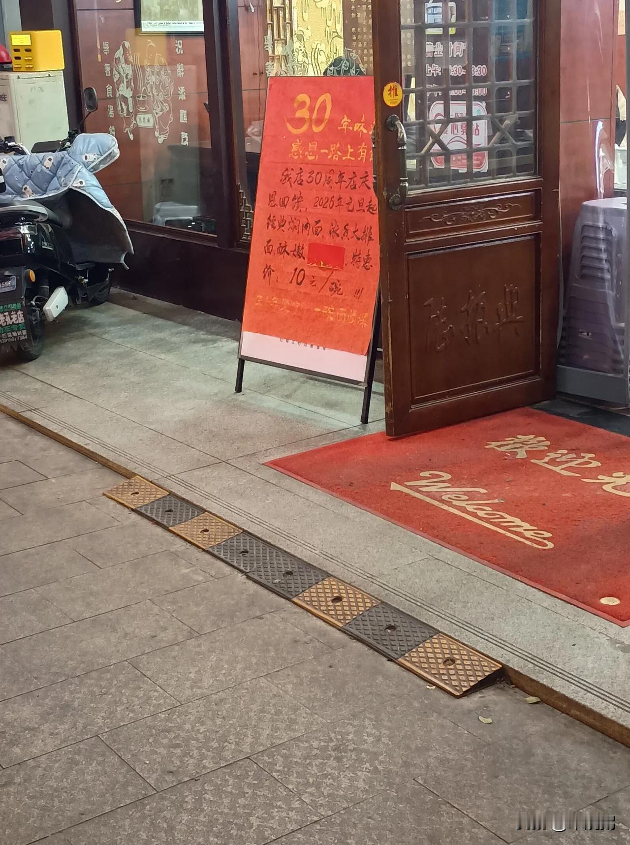 苏州,某面店三十年店庆优惠活动。 图一,焖肉面、大排面、爆鱼面均价十元。 图二,
