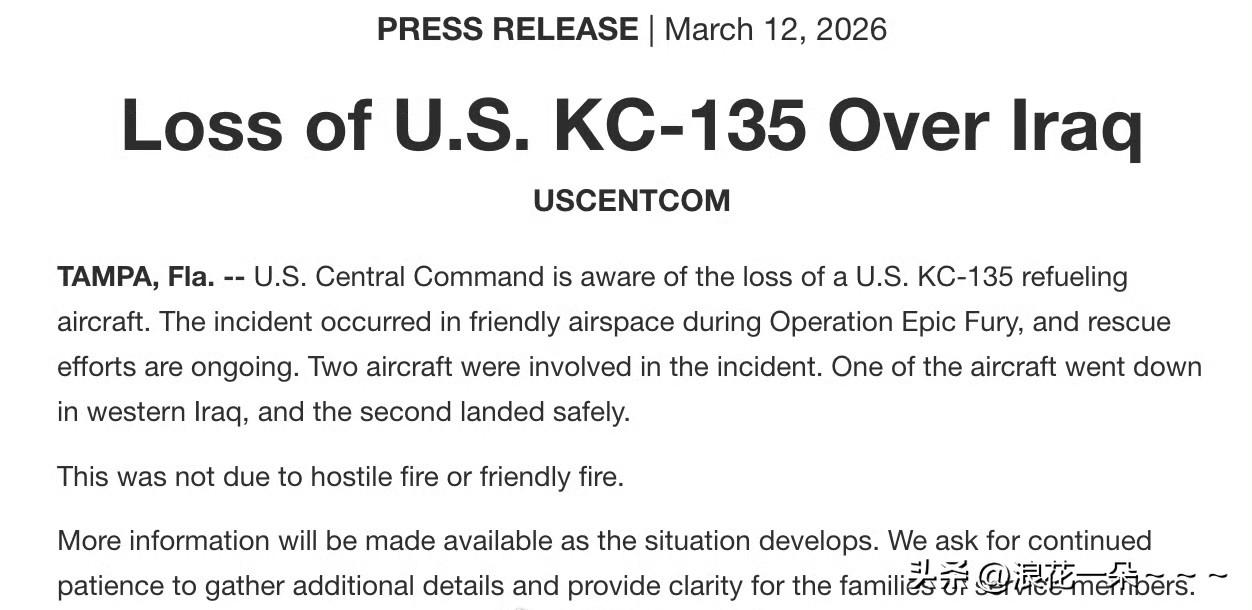 快讯!突发! 美国中央司令部:一架美军 KC-135 空中加油机失事。此次事件涉及两架飞机,其中一架在伊拉克西部坠毁,另一架已安全降落。 这起事故并非由敌方火力或友军误击造成。 资料显示,KC-135是一款性能可靠、载油量大、适应性强的经典机型,推力达21,634磅/台,最大速度约 982公里/小时,升限 15,240米 ,核心加油能力:最大载油量约 90-92吨,单机造价约5000万美元。 信息来源,CCTV国际时讯。