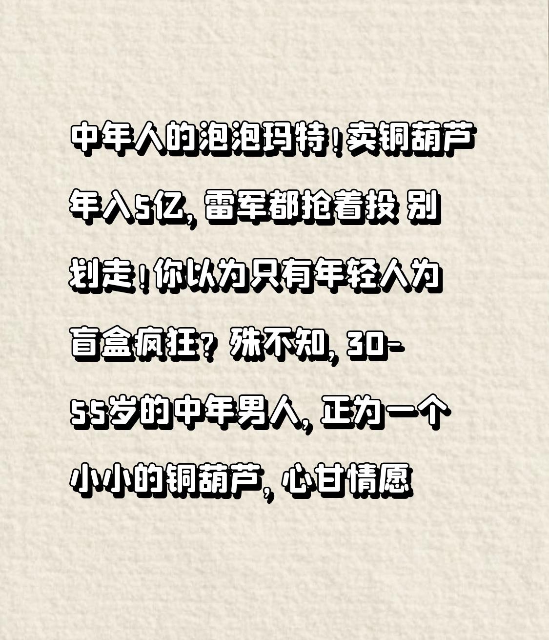中年人的泡泡玛特!卖铜葫芦年入5亿,雷军都抢着投 别划走!你以为只有年轻人为盲盒疯狂?殊不知,30-55岁的中年男人,正为一个小小的铜葫芦,心甘情愿掏空钱包! 一个39块钱的铜葫芦,一年狂卖50万件;一个靠铜器起家的品牌,年营收干到5.7亿,还被雷军称为“小米体系外最像小米的公司”,这就是被称作“中年男人泡泡玛特”的铜师傅。 谁能想到,曾经被认为“消费力不如狗”的中年男性,竟撑起了一个年入5亿的隐秘市场。他们不追潮玩、不买奢侈品,却对铜葫芦、大圣、关公、财神这些铜摆件情有独钟,有人一年消费上百万,把家里堆成小型铜器博物馆。 为啥一个铜葫芦,能让中年男人如此上头? 说白了,不是葫芦多好看,而是它装着中年人的体面与寄托。葫芦谐音“福禄”,是刻在中国人骨子里的吉祥符号;对奔波半生的中年人来说,它不是摆件,是求平安、盼顺遂、想守住家业的心理慰藉,是不用言说的精神刚需。 更绝的是,它把“高端铜艺”拉下神坛。以往铜器都是动辄上千的工艺品,普通人买不起;铜师傅用工业化生产,把成本打下来,39块就能入手,人人都消费得起,复购率高达56%。 但你以为这只是靠情怀赚钱?转折点来了! 这门生意远没表面光鲜。铜价一涨,利润就跳水;整个铜文创市场才16亿规模,铜师傅占了35%份额,却被卡在5亿营收瓶颈难突破;想跨界做塑胶潮玩吸引年轻人,收入占比还不到3%。 而且行业竞争激烈,朱炳仁等品牌紧随其后,产品同质化严重,想持续爆火并不容易。雷军投资,是看中它用小米模式改造传统手艺,但中年人的情绪消费,能走多远,还是未知数。 可即便如此,我们依然能看懂一个真相:所有生意,本质都是情绪生意。 年轻人买泡泡玛特,是治愈孤独;中年人买铜葫芦,是安放焦虑。上有老下有小的年纪,不敢病、不敢倒,一个小小的铜葫芦,承载的是对生活的期许,是疲惫生活里的小盼头。 这世上最赚钱的,从来不是最贵的东西,而是最懂人心的产品。铜葫芦卖的不是铜,是中年人的安全感与仪式感。 你身边有没有人喜欢买这类铜摆件?你觉得中年人的快乐,是不是就这么简单?评论区聊聊!