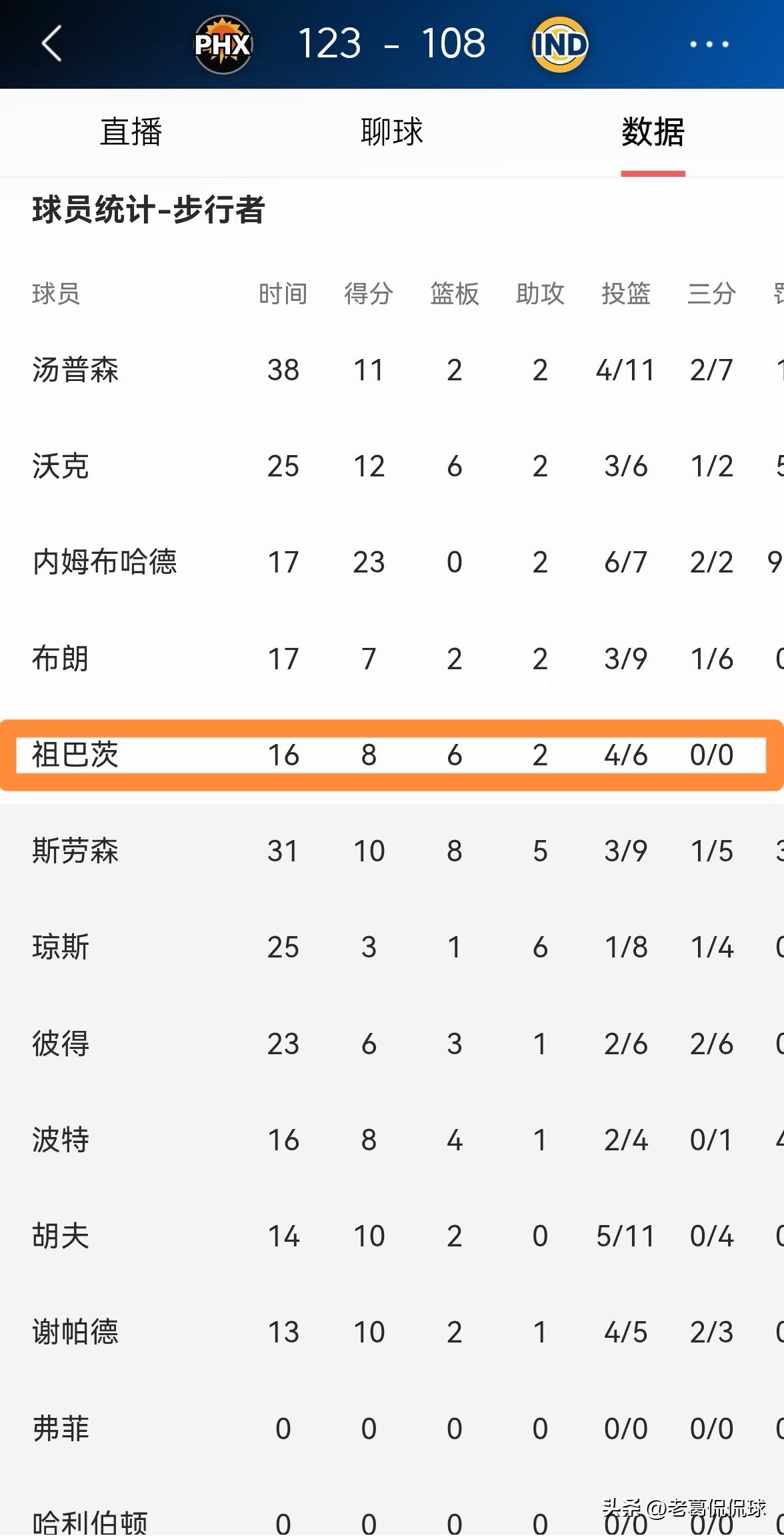 步行者新援祖巴茨真是太让人惊喜了!虽然今天步行者在主场以108:123输给了太阳,但是本场比赛伤愈复出的祖巴茨却打出了让人非常惊喜的表现。 整场比赛下来,祖巴茨仅仅首发出战16分钟,投篮6中4非常高效的砍下8分,还有6篮板2助攻,他的场上正负值为-3。 虽然祖巴茨的状态还没有恢复到自己的最佳水准,但是我相信祖巴茨在名帅卡莱尔的英明调教下,一定会成为球队的内线支柱。就我个人而言,我非常看好祖巴茨在步行者的前景。