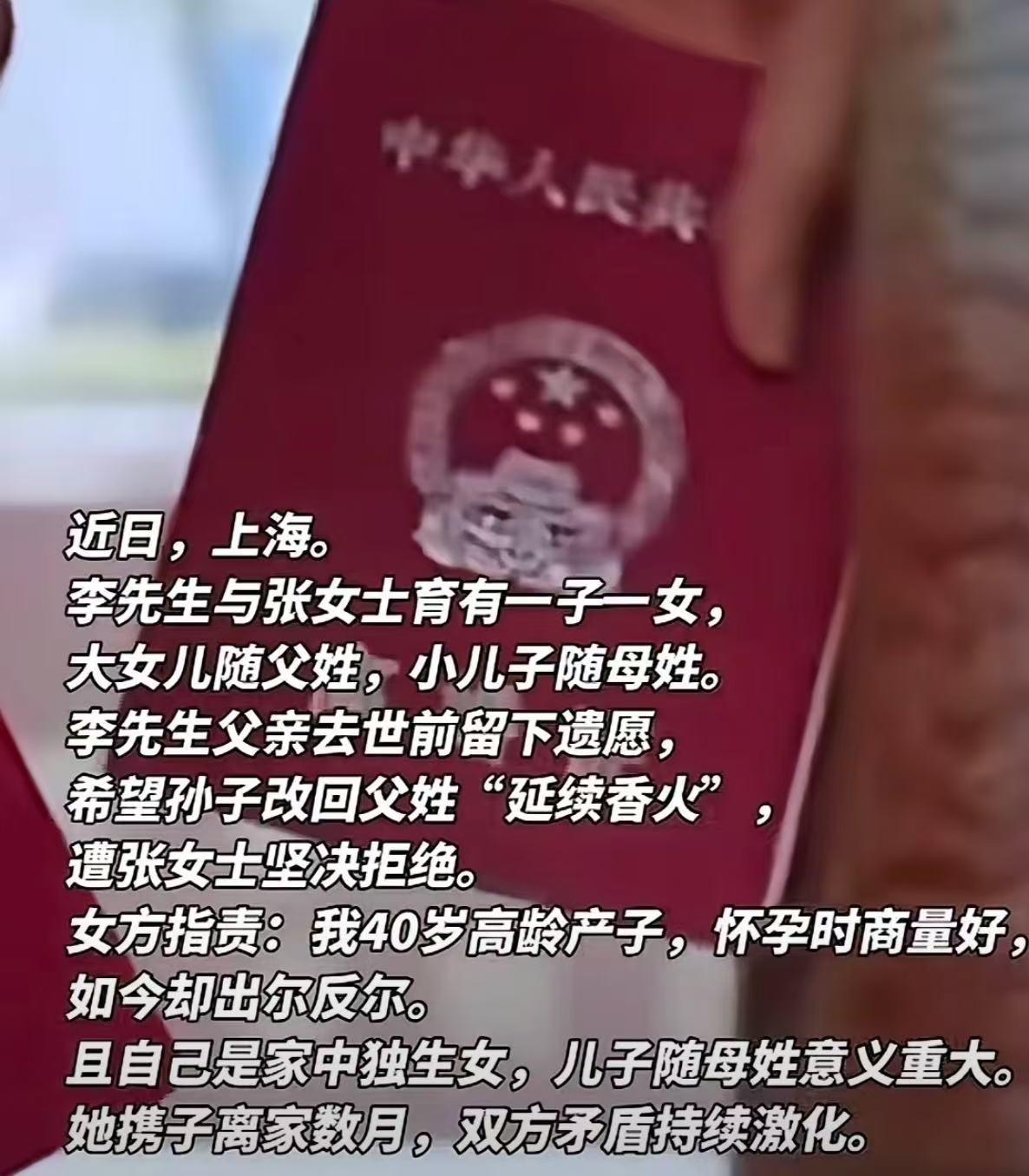 上海,男子父亲离世时留下遗言,要孙子改回父姓“延续香火”!男子想要完成父亲的遗愿,跟妻子商量,妻子却说:“生儿子的时候我差点丢了半条命,你答应两个孩子一个随父姓一个随母姓,怎么能出尔反尔?”男子:“不改就离婚!” 这事的主人公是李先生和张女士,两人当初结婚的时候,没少为孩子的姓氏问题商量。张女士是家里的独生女,从小就被父母疼着长大,她爸妈最大的心愿,就是能有个后代延续张家的血脉。 李先生当时刚和张女士确定婚期,满心都是对未来的憧憬,听完张女士的顾虑,想都没想就答应了,还当场和她立下君子协定:以后要是生两个孩子,老大随父姓,老二随母姓,既不耽误李家传宗接代,也圆了张家老人的心愿。 当时李先生拍着胸脯,语气特别爽快:“没问题!你是独生女,这要求一点都不过分,我肯定说到做到。” 婚后两人的日子过得特别踏实,没两年就有了大女儿,按照之前的约定,孩子顺利姓李,李先生的父母笑得合不拢嘴,张女士的爸妈也没意见,一家人相处得十分和睦。 可等两人考虑要二胎的时候,张女士已经快40岁了,妥妥的高龄产妇,医生多次提醒她,这个年纪怀孕风险极大,不仅容易出现并发症,生产时也可能有生命危险。 身边的亲戚朋友也都劝她,有个女儿就够了,别再遭这份罪,可张女士心里一直记着和李先生的约定,也想着给女儿添个伴,让家里更热闹些,最终还是咬着牙,决定备孕。 备孕的过程就格外辛苦,张女士经常失眠、乏力,好不容易怀上了,孕吐又特别严重,吃什么吐什么,瘦得只剩一把骨头。 到了孕晚期,更是出现了妊娠高血压、水肿等多种并发症,每次去产检都要做一堆检查,每次拿到报告都捏着一把汗,生怕孩子和自己出什么问题。 就这样熬了十个月,2019年的时候,张女士拼了半条命,终于在医院生下了老二,是个健康的男孩,一家人都喜出望外。 按照当初的约定,大女儿姓李,这个小儿子就顺理成章地随了妈妈的姓,姓张,张女士的父母得知后,激动得好几宿没睡好,还特意摆了酒席,宴请亲朋好友。 接下来的几年,李先生确实是个让人挑不出错的好丈夫、好爸爸。他知道张女士生二胎不容易,主动包揽了家里大部分的家务,洗衣做饭、接送孩子上下学,从来不让张女士多操心。 对两个孩子也一视同仁,不管是女儿还是儿子,他都疼得不得了,过年过节给两个孩子买一样的礼物,平时陪他们一起玩耍、写作业。 一家人的小日子过得蜜里调油,身边的人都特别羡慕他们。谁也没想到,这样平静幸福的日子,会被一场突如其来的变故彻底打破。 去年下半年,李先生的父亲突然查出重病,住进了医院。李先生放下手里的工作,天天在医院陪护,带着父亲辗转上海多家大医院治疗。 可病情还是一天比一天恶化,最终还是没能留住老人,老爷子弥留之际,意识已经有些模糊,说话都断断续续的,却死死抓着李先生的手不肯松开。 老泪纵横地反复叮嘱他:“儿啊,咱家不能断了香火啊……老二虽然是亲孙子,但姓了张,这在族谱上就算外人呐……你答应爹,一定让孙子改回李姓,好好延续李家的血脉,爹到了地下,也能瞑目了。” 看着父亲带着遗憾闭上眼睛,李先生心里像压了一块大石头,特别不是滋味。他觉得自己作为李家唯一的儿子,没能完成父亲最后的心愿,就是不孝,所以下定决心,一定要让小儿子改回李姓。 几天后,他趁着家里气氛稍微缓和些,小心翼翼地找到张女士,跟她商量改姓氏的事,可话刚说完,就被张女士一口拒绝了。 张女士一想起生小儿子时的艰难,就忍不住红了眼,语气里满是委屈和愤怒。她跟李先生说,自己40岁高龄生子,当时在手术台上差点就没下来,为了这个孩子,她遭了太多罪,瘦了十几斤,还落下了一身小毛病。 当初两人明明说好,两个孩子一个随父姓一个随母姓,这是事先约定好的事,也是李先生亲口答应的,怎么能因为公公的遗愿,就出尔反尔。 而且她是独生女,小儿子随母姓,不只是一个姓氏那么简单,更是延续张家的血脉,对她和她的父母来说,意义重大,她不可能同意改姓氏。 两人就这么吵了起来,各说各的理,谁也不肯让步。李先生急了,觉得张女士不理解自己,也不尊重九泉之下的父亲,一时冲动就说出了“不改就离婚”的狠话。 这话像一根刺,狠狠扎在了张女士的心上,两人的矛盾彻底激化,张女士当天就收拾了东西,带着小儿子回了娘家,两人就这么僵持了好几个月,连过年都没凑到一起。 而李先生后来也一纸诉状递到了法院,要求离婚并责令张女士配合改回孩子姓氏,但法院审理后认为,两人的夫妻感情并未破裂,姓氏争议不属于法定离婚情形,最终驳回了他的离婚诉求。 对于张女士而言,她争的从来不是姓氏的胜利,而是一份被看见、被尊重的尊严。她拿命换来的孩子,承载着母爱的伟大,不应成为满足他人执念的牺牲品。 信源:大江网