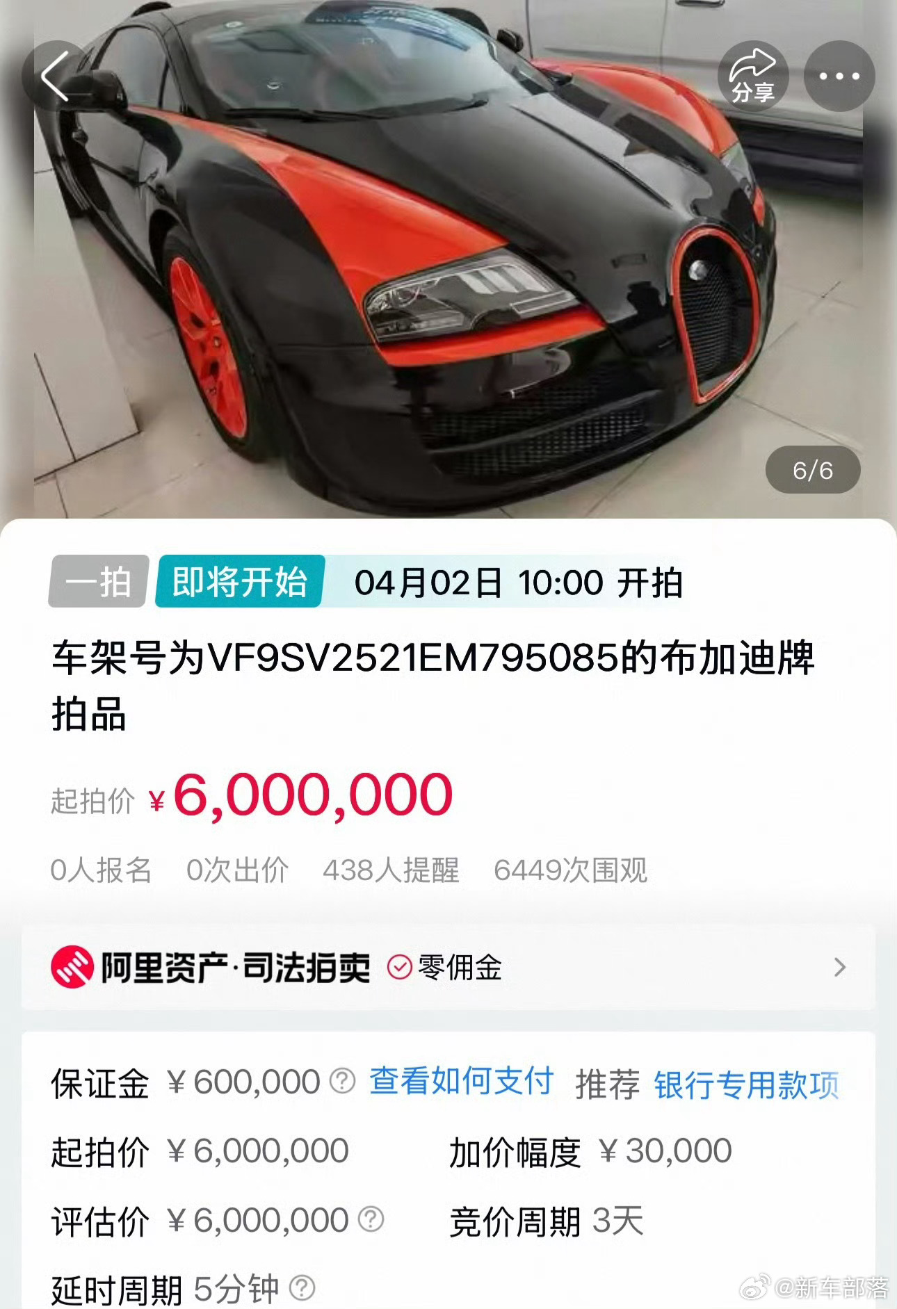 法院拍卖布加迪跑车强调无法上牌全球限量8台、新车价超4000万的布加迪威航,现600万起拍却因车架号被改无法上牌。这款曾创408.84公里/小时最快量产敞篷车纪录的超跑,2018年曾以2568万拍出,后因无法上牌买家退车。如今再次拍卖,它成了只能看不能开的“天价摆件”,这波操作你怎么看?