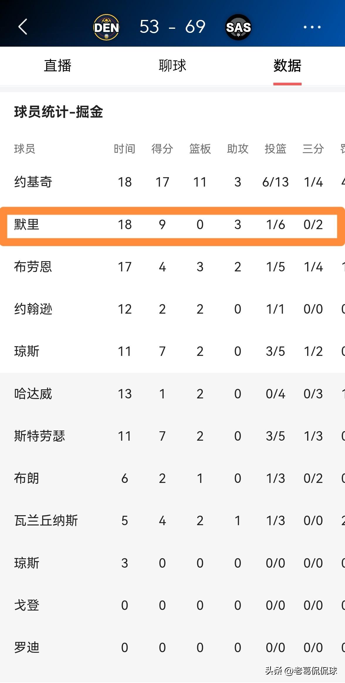 掘金当家后卫穆雷真是大失水准!在今天掘金客场挑战马刺的比赛中,目前双方的上半场比赛已经结束,掘金以53:69落后对手16分。让人感到非常意外的是,在前两节比赛中,穆雷的表现非常的失常,他在首发出战的18分钟里,投篮6中1,其中三分球2中0、罚球7中7非常低效的得到9分,还出现了4次失误,他的场上正负值为-6。 实事求是的说,正是由于穆雷的发挥失常,才导致掘金在上半场比赛结束时大比分落后于马刺。