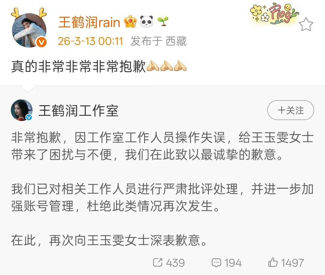 3月13日,凌晨,女演员王鹤润向演员王玉雯道歉,起因是有娱乐博主吐槽王玉雯不适合古偶妆造,晚上10点王鹤然微博大号居然在底下评论赞同说王玉雯古装太肿太蠢了,一点都不灵气。 过了两个小时,晚上12点王鹤然才发文向王玉雯道歉,称非常非常非常抱歉,解释那条评论不是她本人发的,而是有工作人员登录她的账号发的,对此她感到非常抱歉,已经对那名工作人员进行了批评。 王鹤润现在在西藏拍戏,而用王鹤润大号发的IP地址是在上海,说明确实不是王鹤然本人发的,而是工作人员用她的账号评论的时候忘记切换账号了。 话说王鹤润和王玉雯不是好朋友来着?怎么王鹤润工作室人员会这么点评她的好朋友。 看来俩人的友谊也没有像她们对外人表现的那么亲密,如果是那种很好的闺蜜,王鹤润工作人员就不会背地里吐槽王玉雯了。