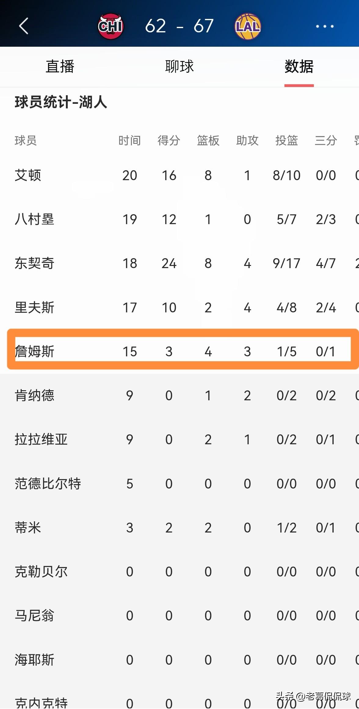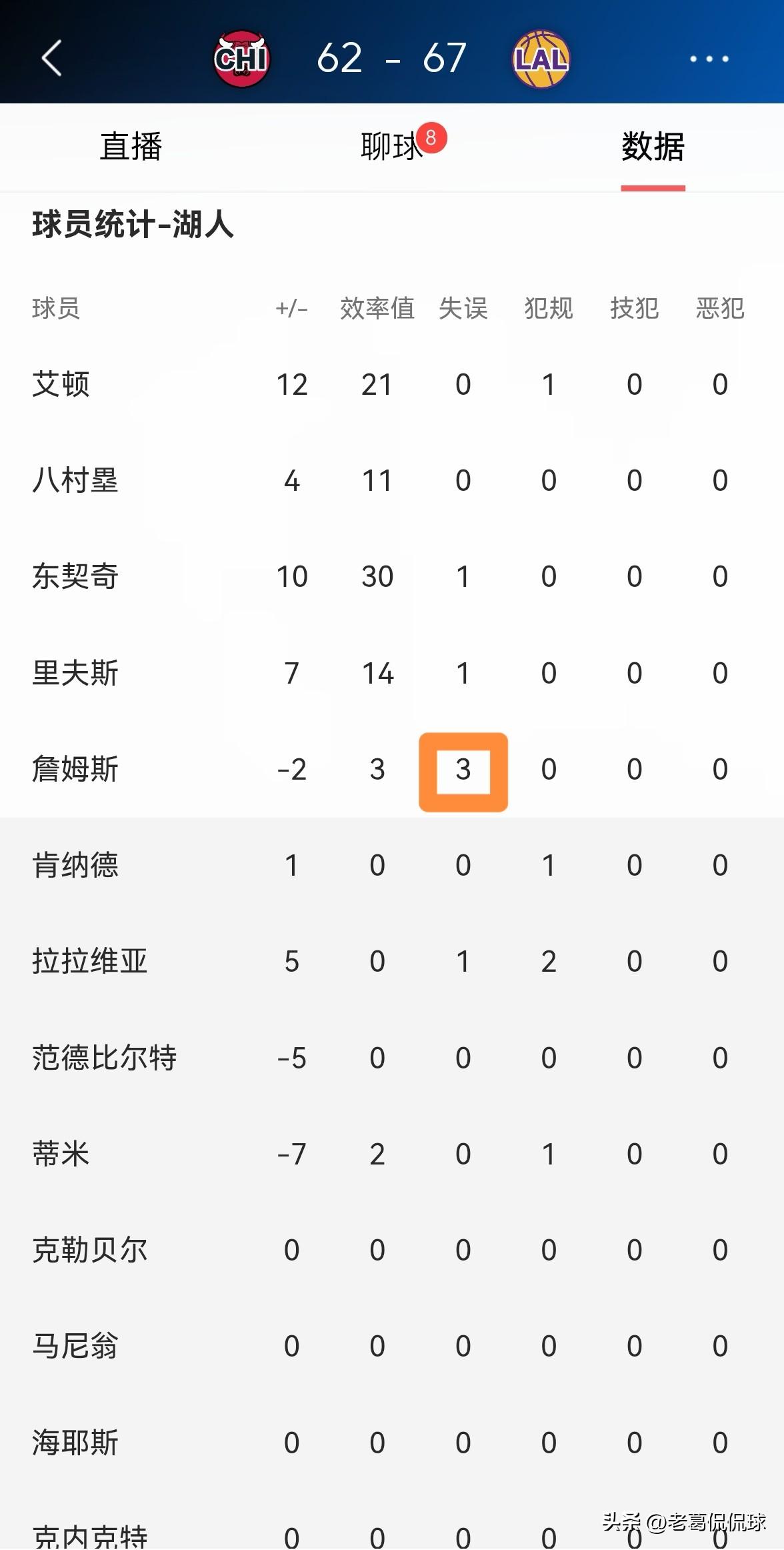 湖人巨星詹姆斯的失误数竟然和得分一样多!在今天湖人主场迎战公牛的比赛中,目前双方半场战罢,虽然湖人以67:62领先对手,但是詹姆斯的表现却非常的拉胯,他的失误数和他的得分一样多。 在前两节比赛中,詹姆斯首发出战15分钟,投篮5中1,其中三分球1中0、罚球1中1非常低效的得到3分,还有3次失误,他的场上正负值为-2。 坦白说以詹姆斯在上半场比赛中的糟糕表现来看,本场比赛詹姆斯的得分很有可能不会上双。